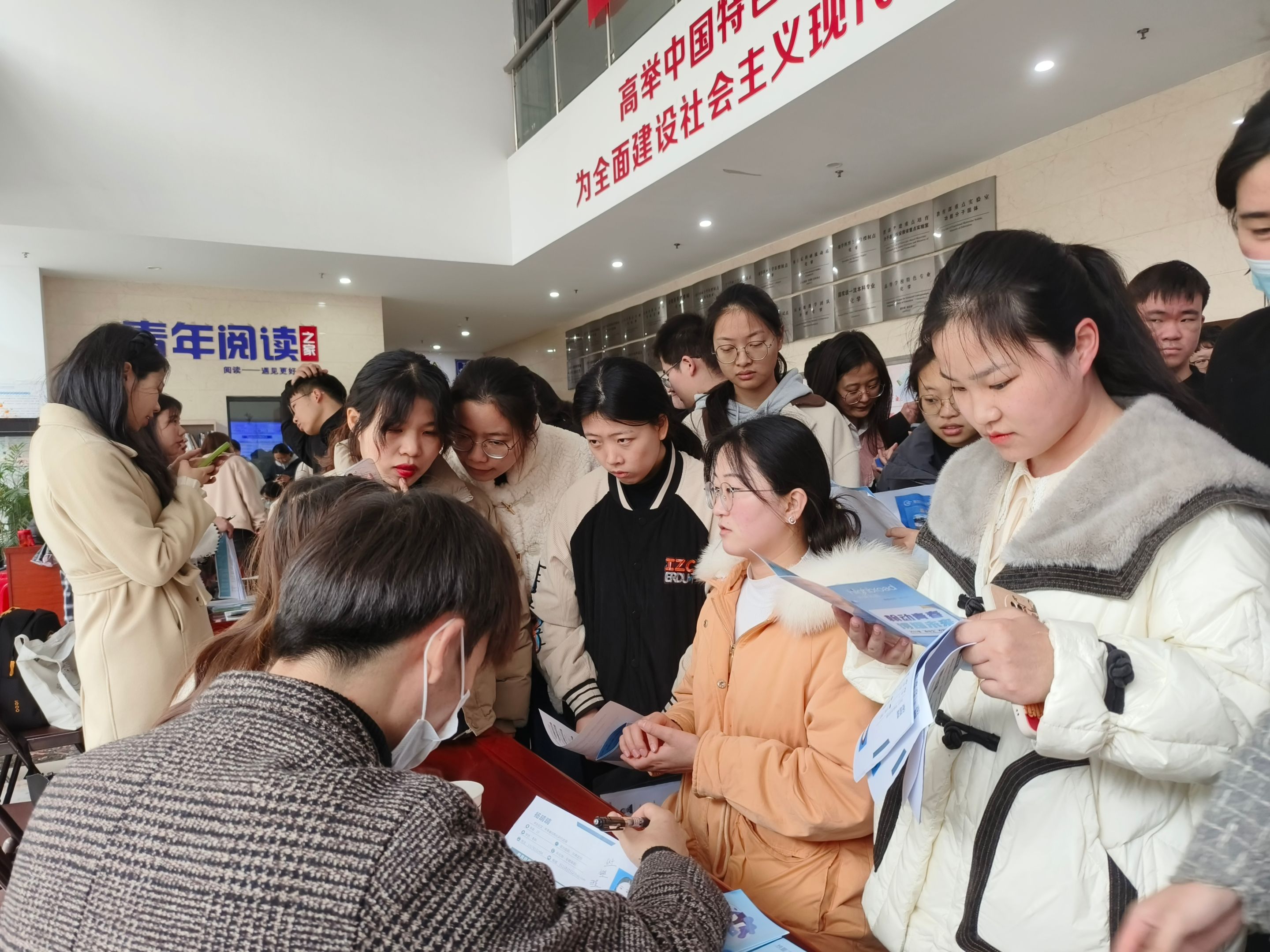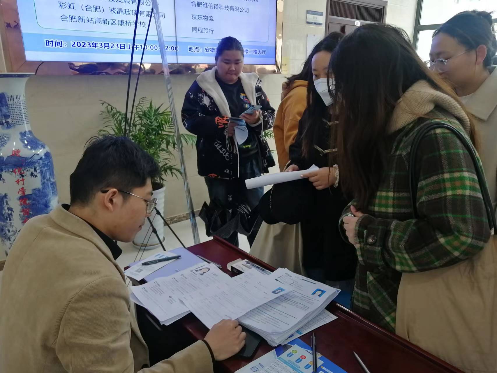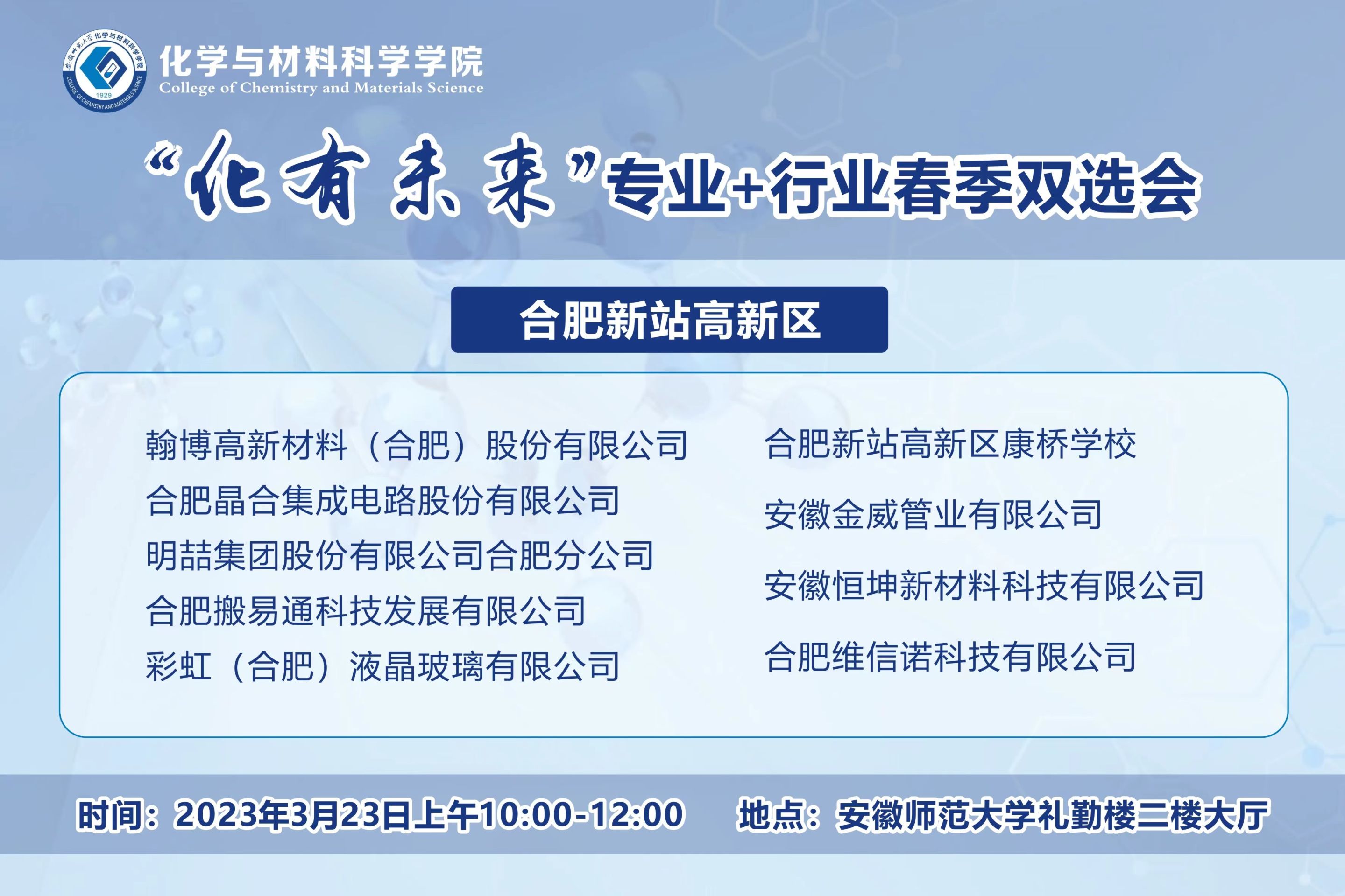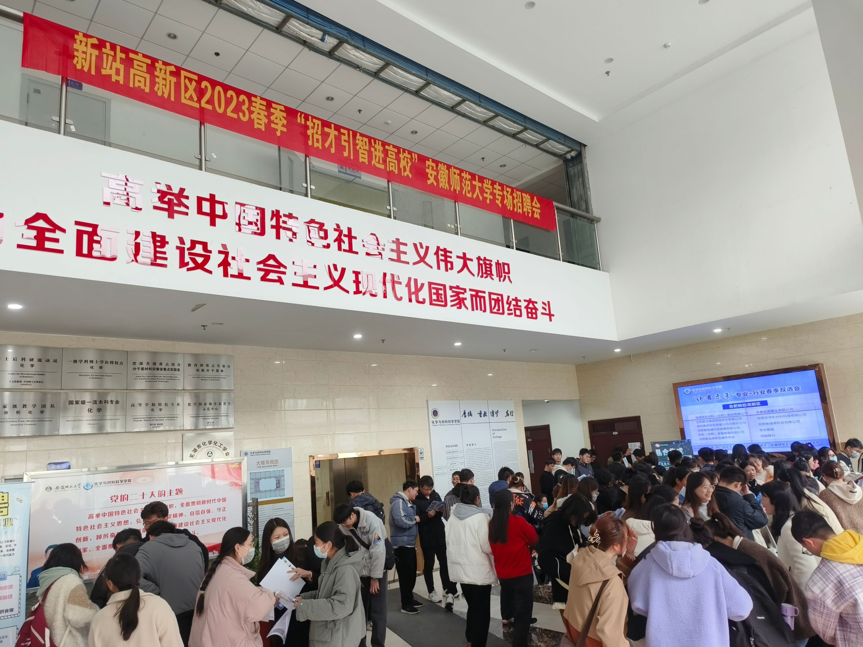 在礼勤楼二楼大厅举办了2023年“化有未来”行业+专业春季专场招聘会,合肥新站高新区人事局张婷组织区域内十余家优质企业来校招聘,提供就业岗位350多个,文理工科多专业本科生、研究生毕业生积极参会应聘。