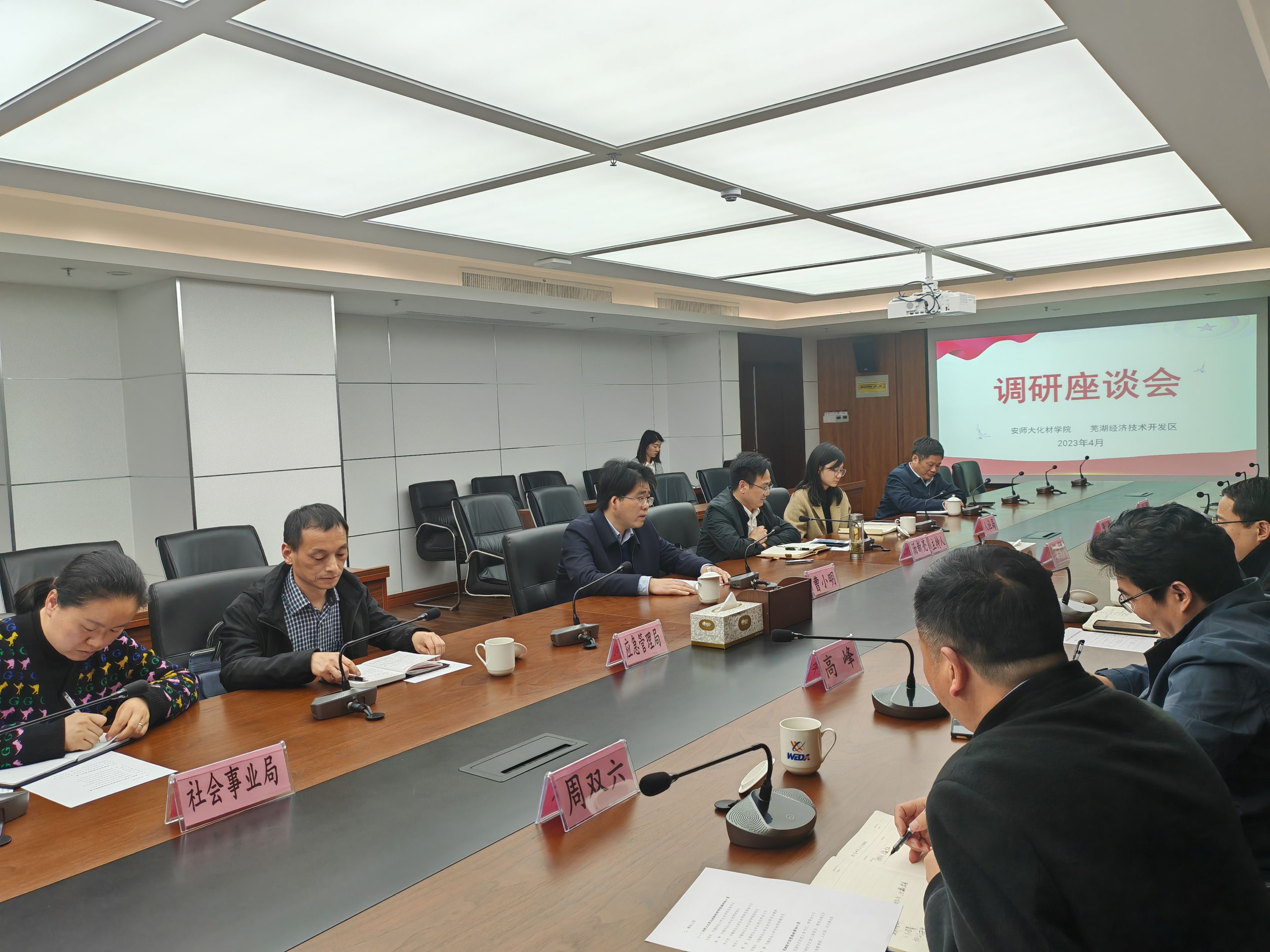 实地调研结束后在经开区管委会召开了调研座谈会,芜湖市经开区管委会主任曹小明、副主任汤新亮、区人社局、区社会事业局、区应急管理局负责人参加座谈。学院院长高峰介绍了学院2023届毕业生基本情况、专业设置、办学特色、人才培养和近几年学生取得的成绩,希望双方能在人才培养、实习见习以及就业创业服务等方面进行全方位深度合作,积极为毕业生创造更大的成长和发展空间,搭建更好的平台为毕业生就创业提供服务。