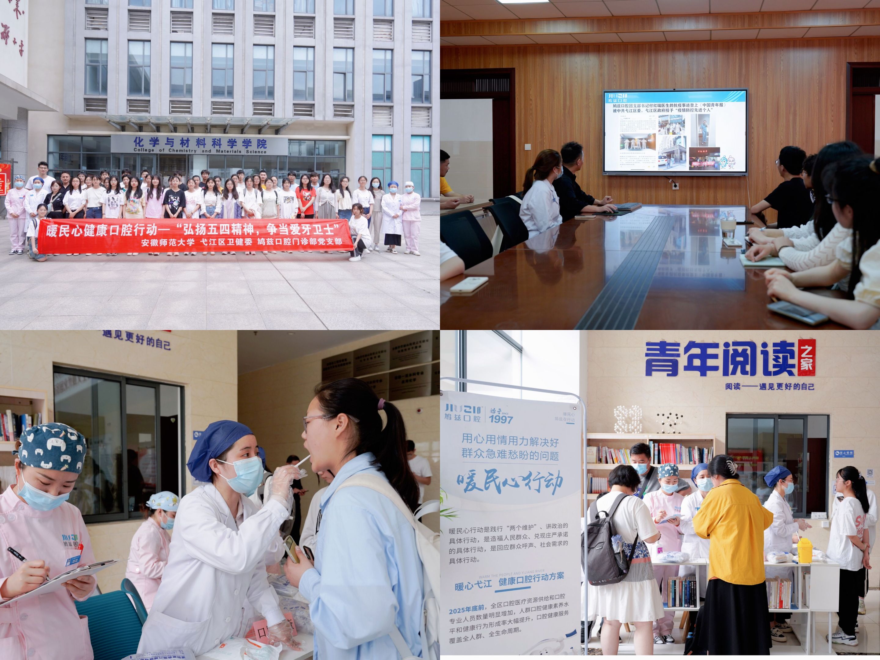口腔义诊强志愿。为积极响应“暖民心行动”的号召,将健康口腔行动进校园活动与高校结合,提升高校师生口腔健康意识和水平,提高口腔疾病防治知识的知晓率,4月24日至5月4日,学院联合鸠兹口腔医院开展“弘扬五四精神,争当爱牙卫士”--暖民心健康口腔行动走进包子漫画