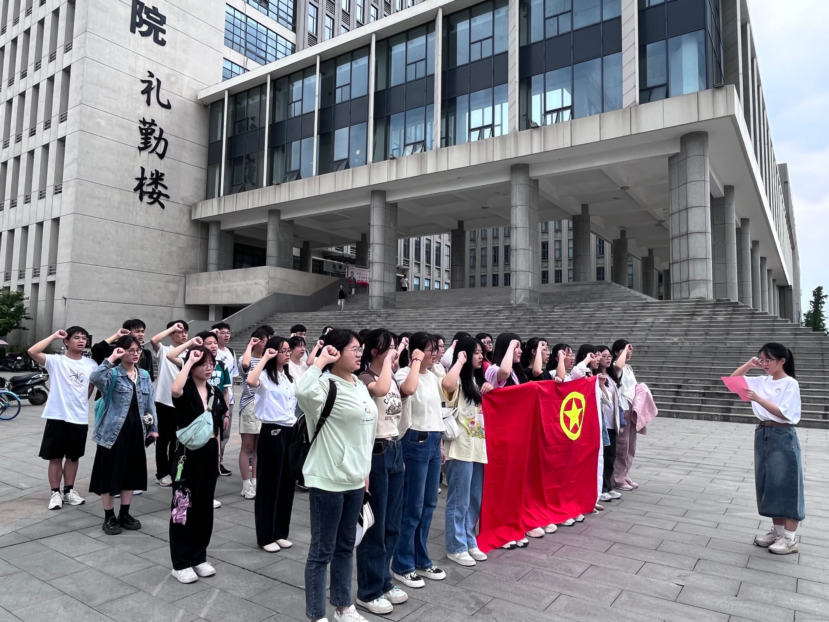 团委组织优秀团员、入党积极分子们在礼勤楼下,面对团旗,高举右拳,目光坚定,在庄严的团旗下进行宣誓,铿锵有力的声音传递出他们身为共青团员的自豪感,展示了作为青年学子奉献国家的坚定理想和追求。同时也让团员们再次领悟加入共青团的真正意义,感悟了中国共产主义青年团的光辉历程。
