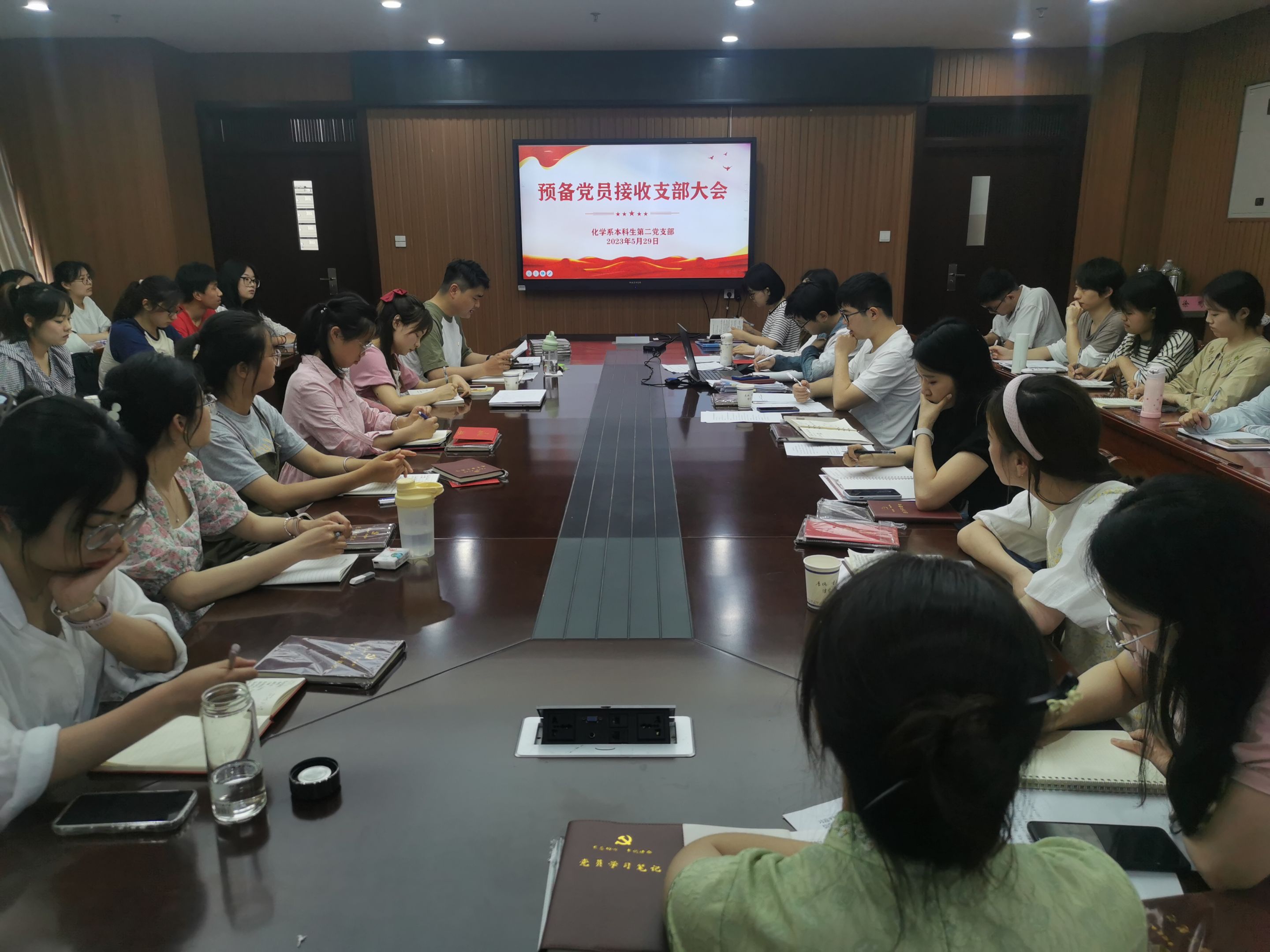 王宇阳、陶勇)2023年5月29日下午,化学系本科生第二党支部于礼勤楼702会议室召开了2023上半年预备党员接收支部大会。本次大会由支部书记陶勇主持,支部全体党员及发展对象共同参加此次会议,学院党委副书记李古州列席指导。