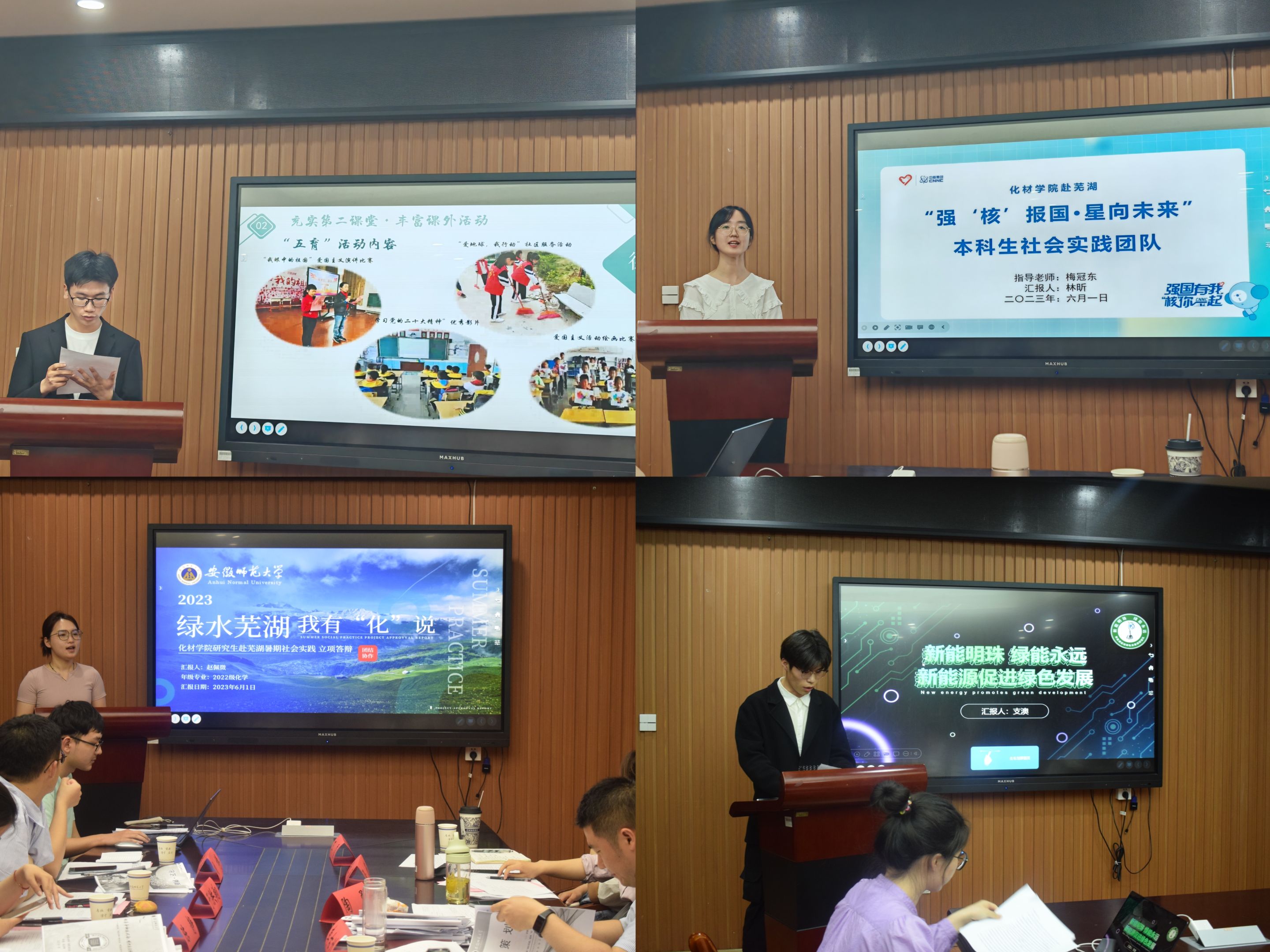 本次答辩会共有29支团队参与,根据实践主题分为先锋化材、奉献化材、学术化材、创新化材。各团队选题丰富,涵盖红色宣讲、科普支教、社会调研、乡村振兴、水质调研等多个层面,并结合国情和新出台的相关政策,关注时下热点问题,策划了一系列的实践活动。每个团队均有对应的指导老师,为实践活动的开展提供意见。答辩会上,29名学生代表分别就各自实践团队项目进行了展示和讲解,他们分别从不同的角度出发,运用不同的方法,介绍各自团队的实践方案。其中,“绿水芜湖,我有‘化’说”社会实践团从实践地的实际情况出发,分析了芜湖当地生态环境保护存在的问题,并提出了可行性建议;“守艺·创新”大学生非遗调研团队成员从文化遗产保护角度出发,在实地考察和文献资料收集的基础上,对当地的文化遗产保护方案进行了系统性的梳理并提出合理化建议;包子漫画