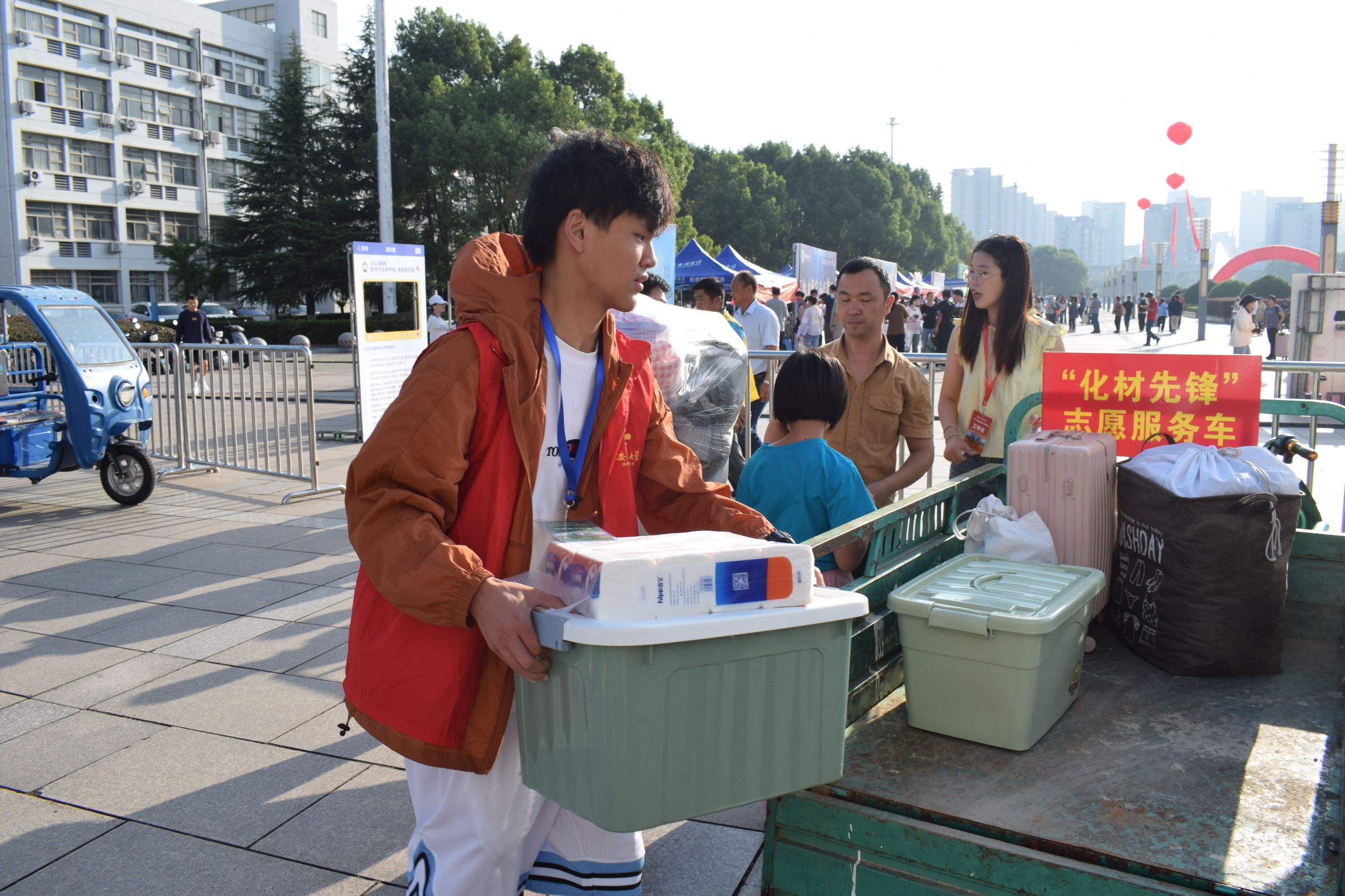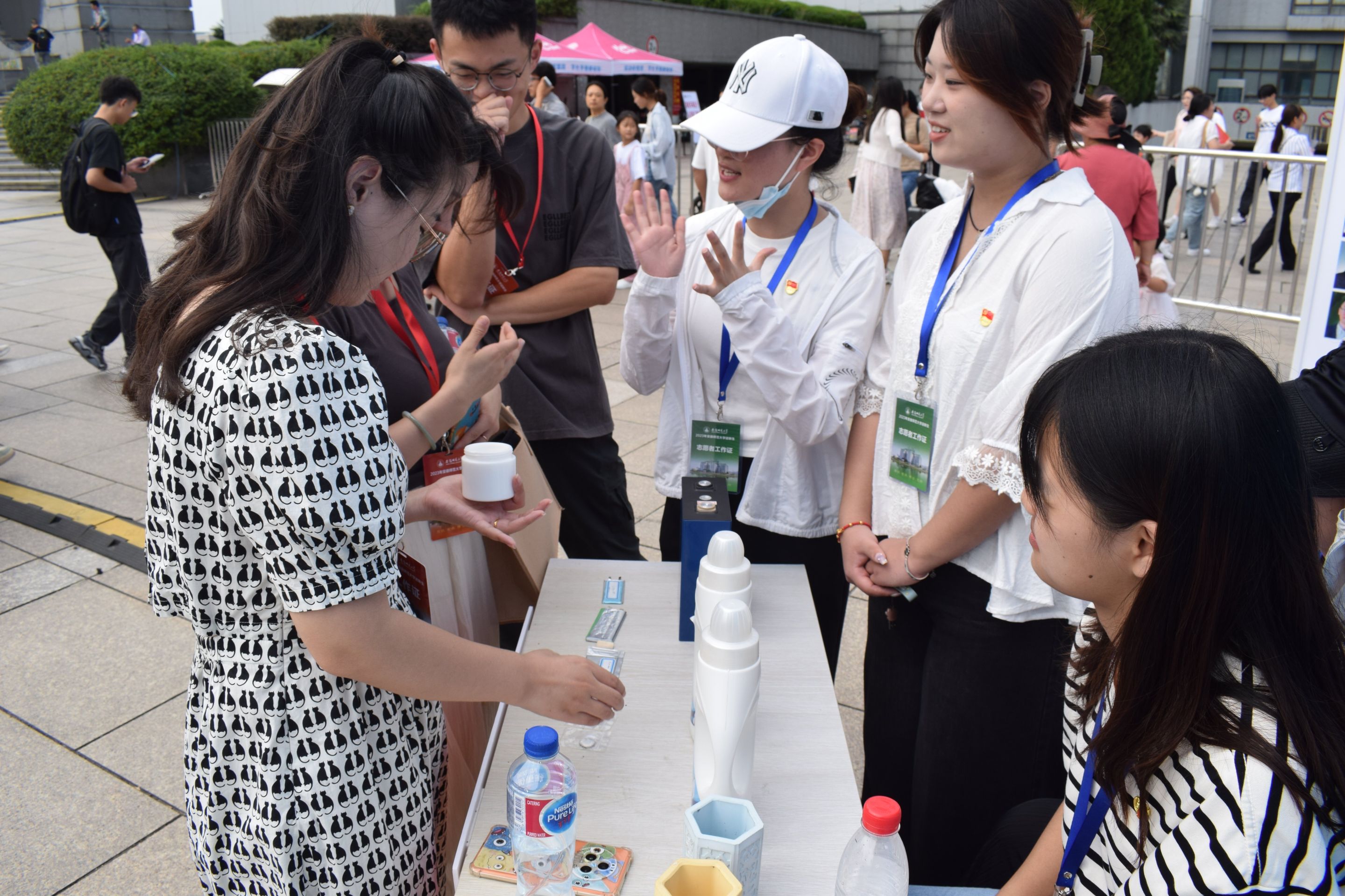 传承迎新经典项目,努力为2023级新生上好大学“第一课”。实训作品展展示了环保笔筒、护肤霜、锂电池、留香洗衣液等一系列学生实习实训自制产品;新生礼品袋里定制笔记本、定制卡套、帆布包及环保杯,体现出学院老师、同学对新生的殷切关怀;志愿服务岗和党员先锋岗上高年级学生在志愿迎新工作中展现“化材人的样子”。