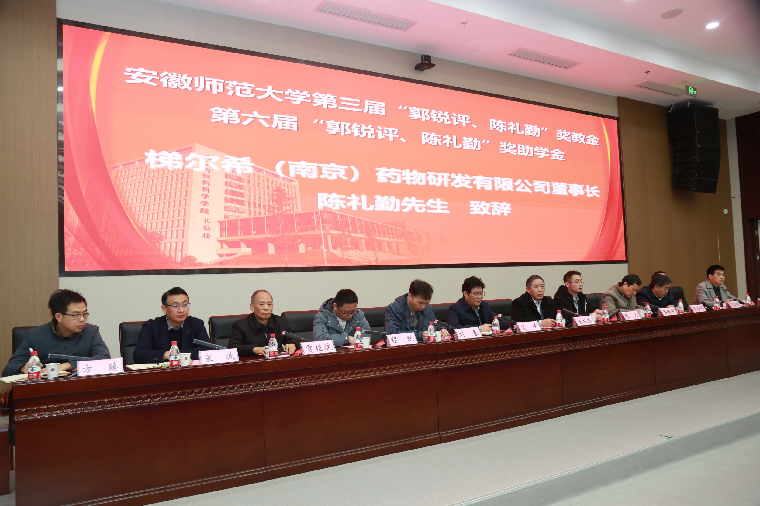 陈礼勤先生对获奖老师、受奖助的同学表示祝贺。他深情的向全体师生讲述了个人在师大的求学生涯、公司创办历程和取得的丰硕成果。他指出,加拿大TLC是世界最大药物标准品研发公司,自2007年公司创办以来,16年的时间公司规模位于全球同行之首、产品现有两万余个。他强调,公司经营与人才培养理念先进,一直在不断探索与创新,新产品和公司均呈快速发展模式,产品销售遍布全球七十多个国家。他鼓励广大教师能够把科研知识转化到实际应用中去,用心去做产学研合作;他向广大同学发出邀约,希望母校毕业生能够选择并加入梯尔希(南京)药物研发有限公司,为公司注入新力量,助力公司发展与母校建设更上一层楼。