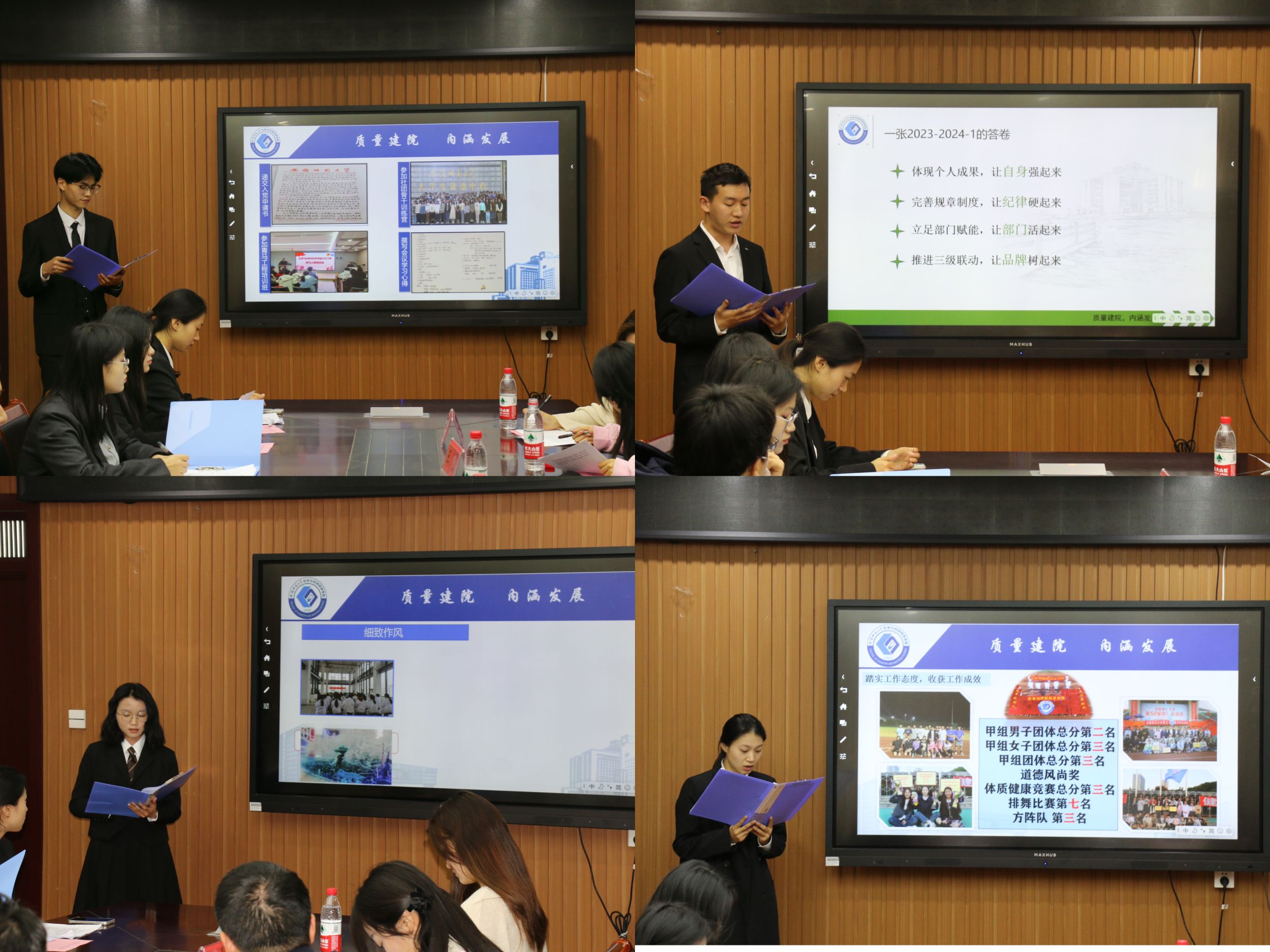 院学生会主席团成员、各部门部长依次从政治态度、道德品行、学习学术、工作成效、纪律作风、工作不足等方面进行述职报告。他们分别从不同角度和层面,详细阐述了在过去一年中的成绩和亮点,展示了部门工作成果,分享了自己的心得体会,对工作中出现的具体问题进行了剖析并提出了解决方案,同时阐释对未来工作的构想。他们纷纷表示,通过一学期的努力,不仅提高了自己的组织能力和沟通能力,也深刻认识到作为一名学生骨干的责任和担当。