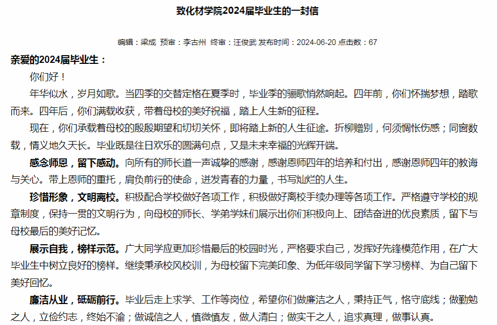 2024届毕业生的一封信》,引导毕业生感念师恩、珍惜形象、展示自我、廉洁从业,祝福全体毕业生一帆风顺,前程似锦!