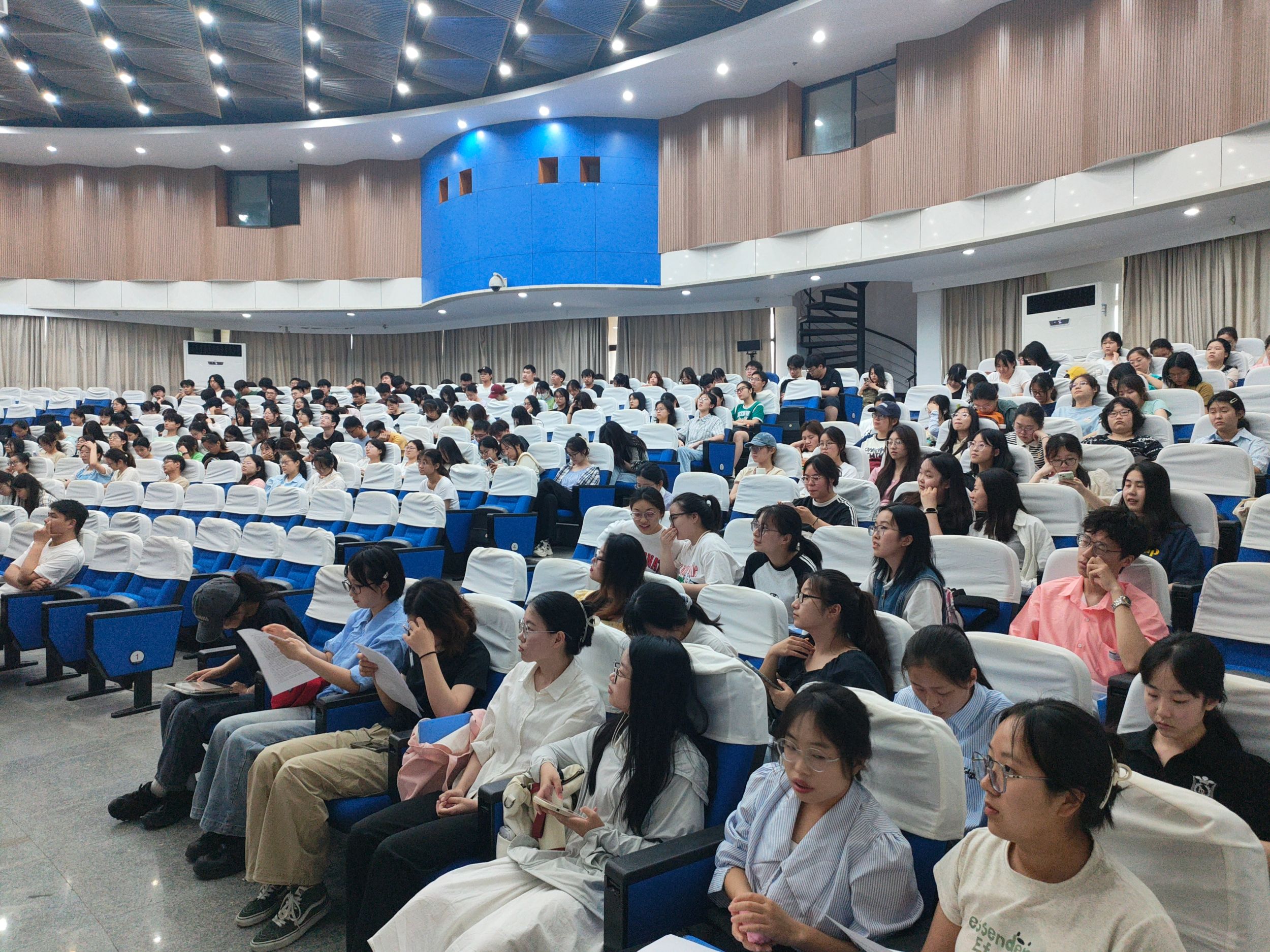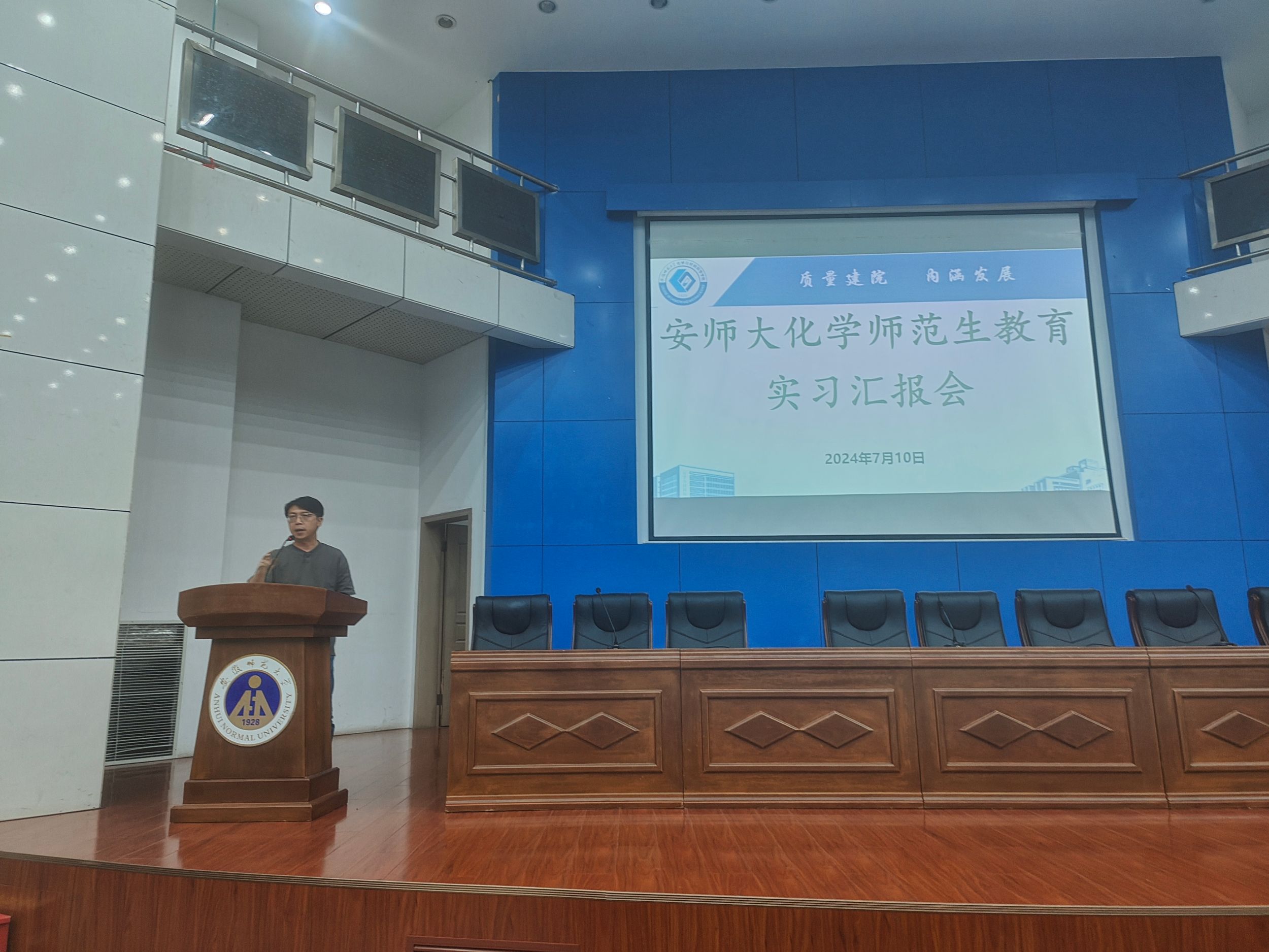 在敬文图书馆报告厅举行2021级化学师范专业教育实习成果汇报暨经验交流会,学院教学副院长崔鹏、校内指导教师代表、相关专业辅导员、2021级化学师范专业实习生代表、2022级化学师范专业全体学生参加会议,本次会议由程瑶琴老师主持。