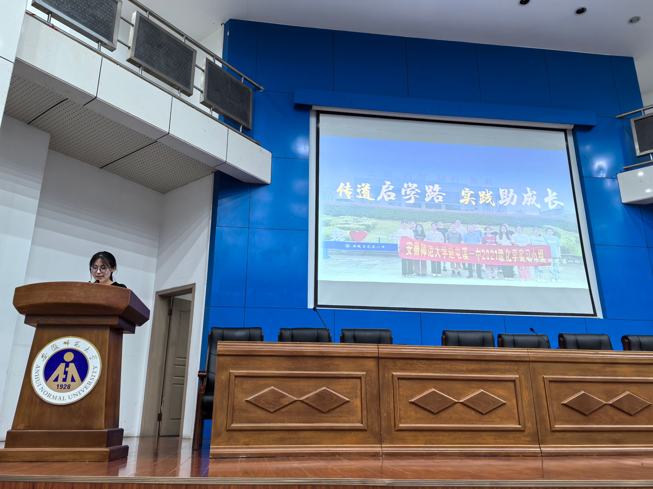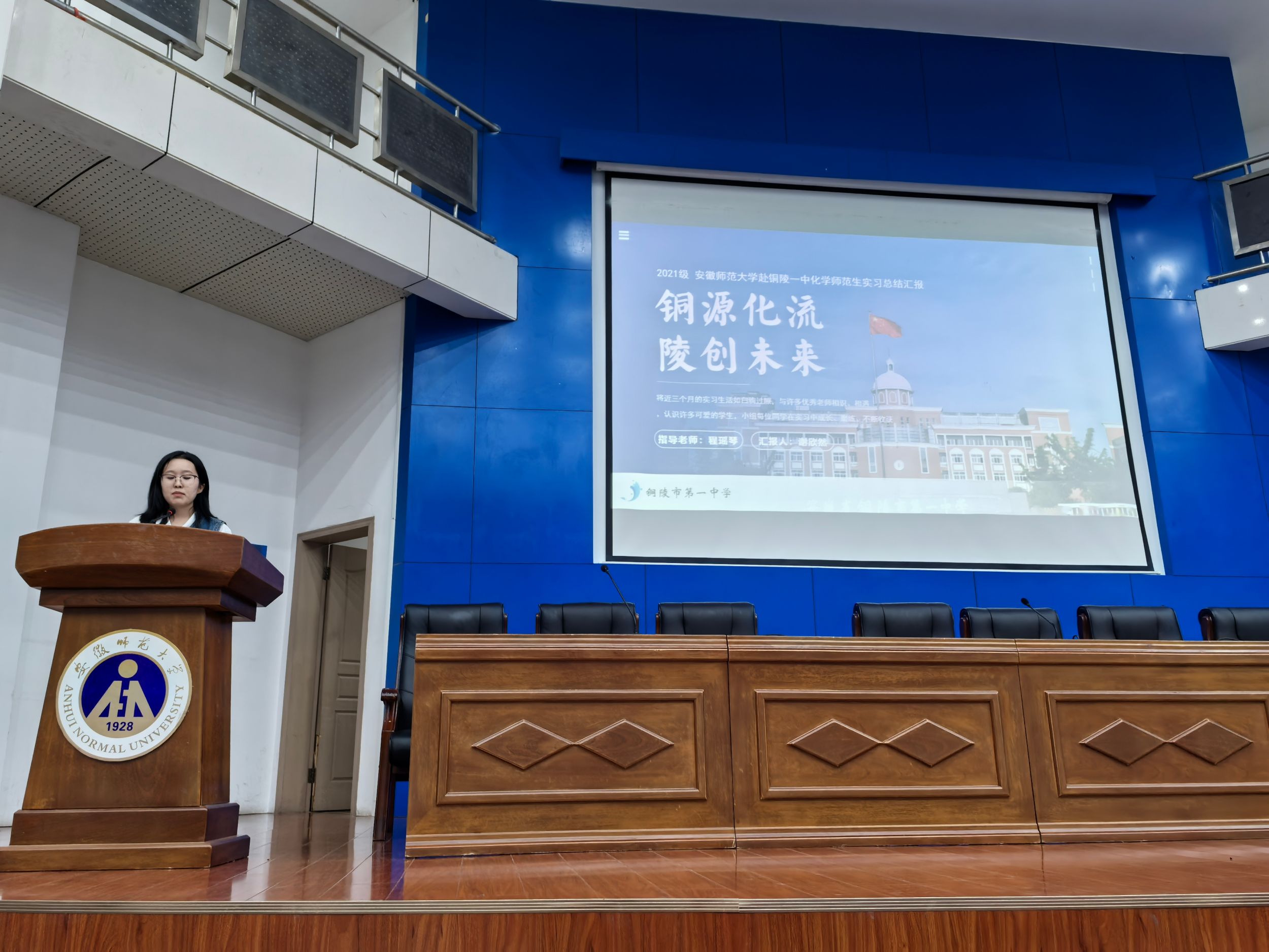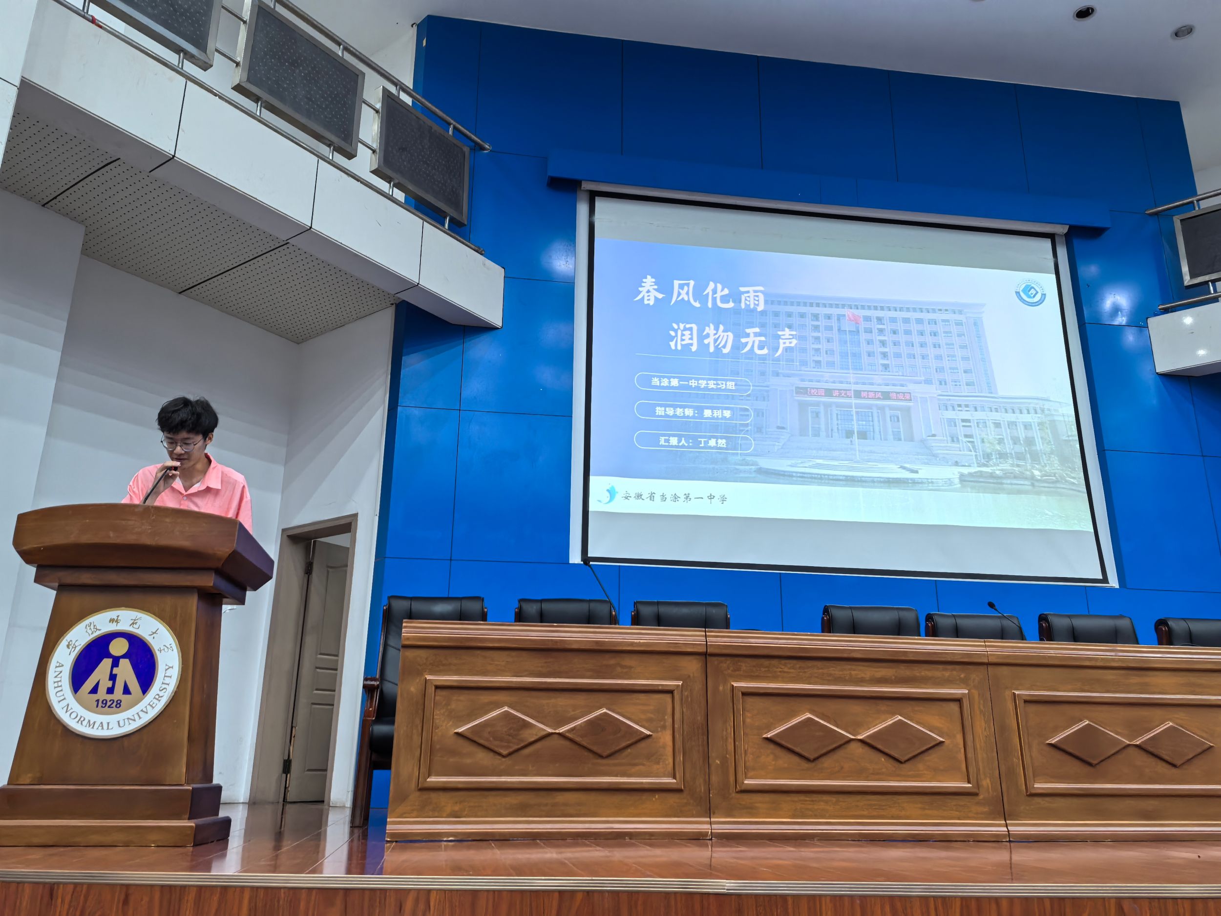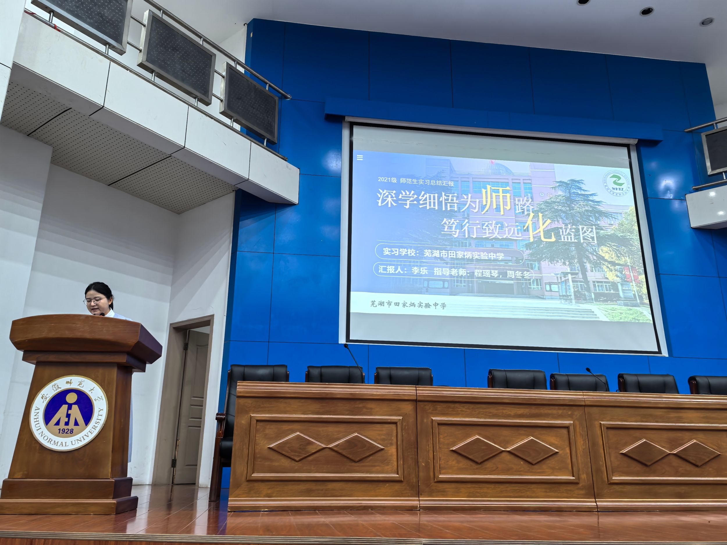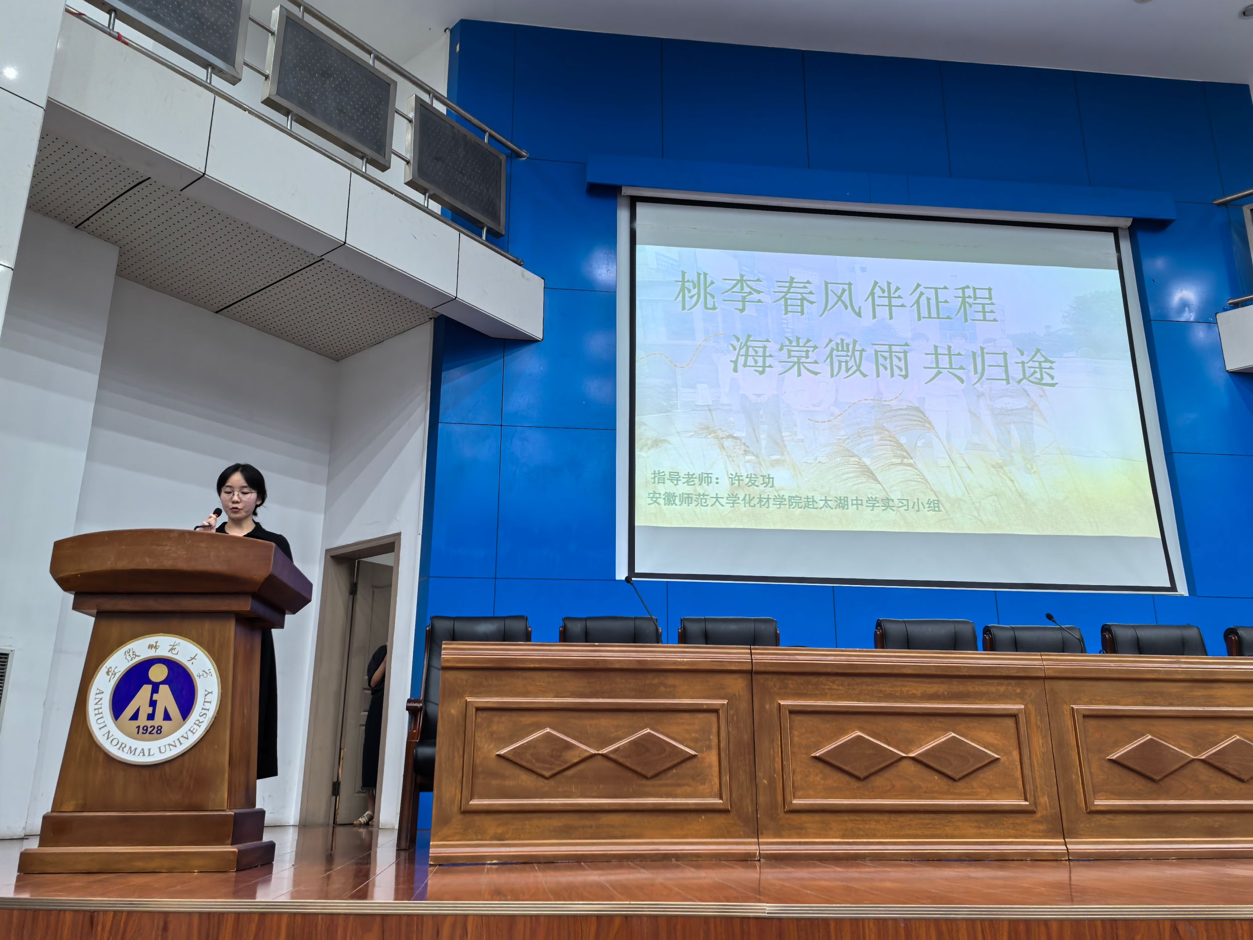 程瑶琴简述了本次教育实习的基本情况,随后,来自歙县中学、屯溪一中、当涂一中、安师大附中、芜湖县一中等16所实习单位的实习生代表分别对各自实习小组的实习成果进行依次汇报。他们结合着各自两个多月以来的实习经历,围绕着“教研观摩”、“教学开展”、“班主任工作”、“特色活动”等方面展开汇报,分享了实习期间的感受与收获,并深刻反思了实习过程中遇到的挑战和问题。