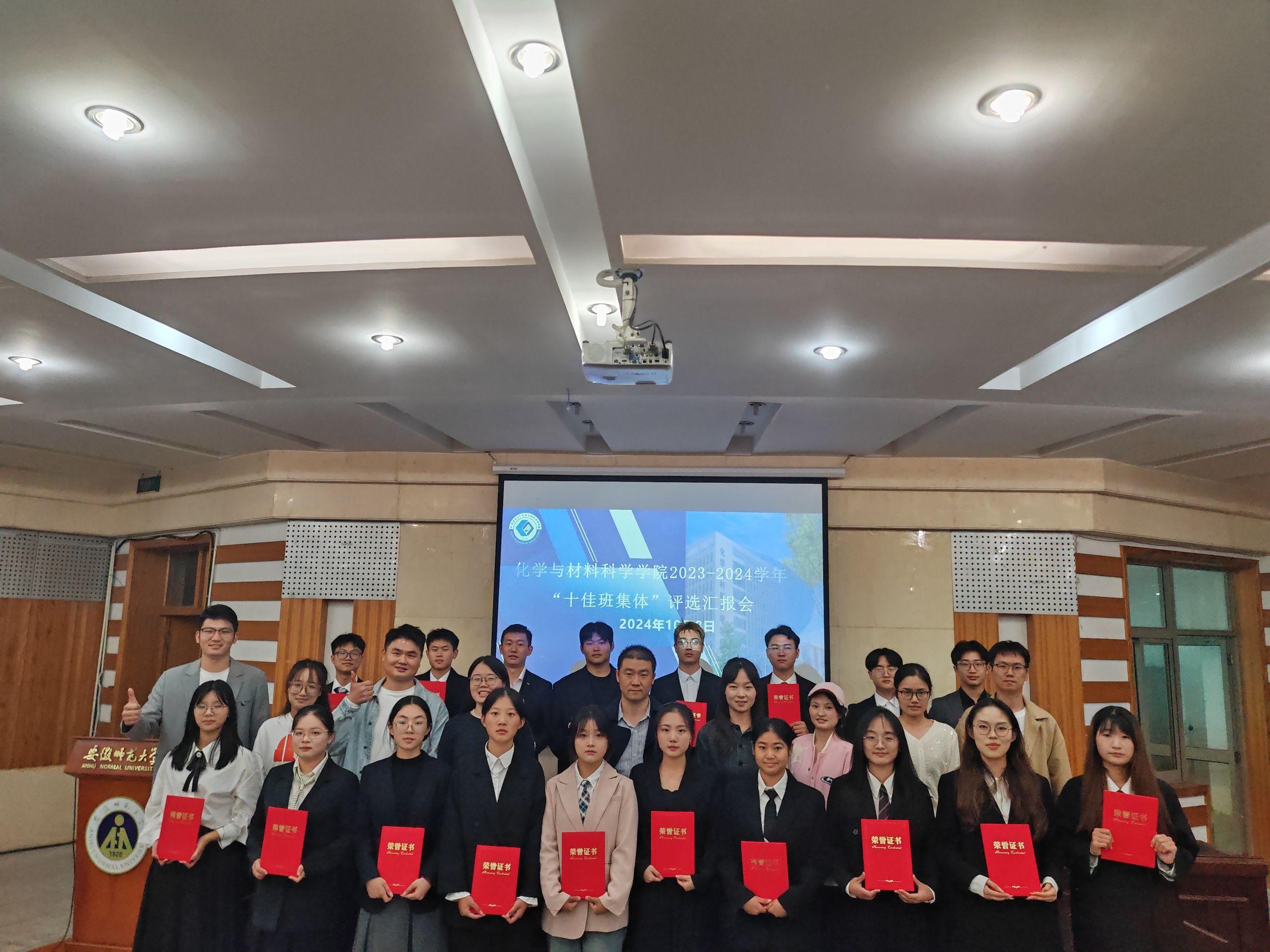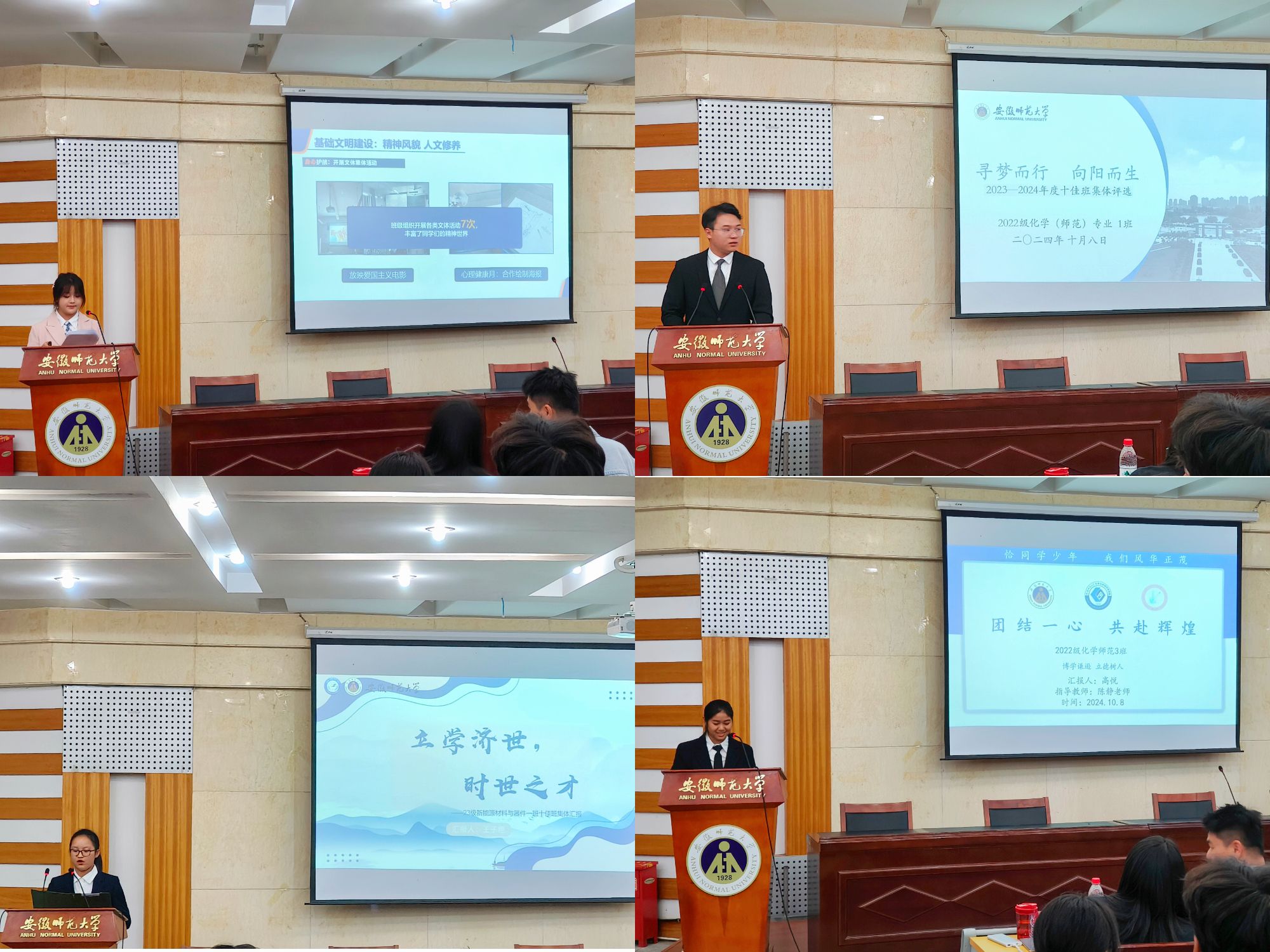 本次学院“十佳班集体”评选共有19个班集体参加现场汇报。各班代表依次上台汇报,他们生动地向评委老师及同学们展现班级的卓越风采。“材结春华竞风采,化育英才展未来”21级材料化学2班的同学们在学科竞赛方面全面开花、在志愿服务方面躬身奉献,努力为社会贡献一份力量;“化风为师韵,Cu Zn共筑梦”22级化师2班的班级代表用具体的数字展示了班级独特的风采,高课程通过率、高竞赛获奖率是班级优良学风的展现,更是同学们对自我要求的完美诠释;“Zn勤圆梦,奔赴Li想”23级化师5班的汇报人表达班级成员团结拼搏,勇敢逐梦,昂扬向上的学习态度和人生姿态。各班级的演讲十分精彩,每一段文字、每一张图片,都是化材人良好班风建设的体现。