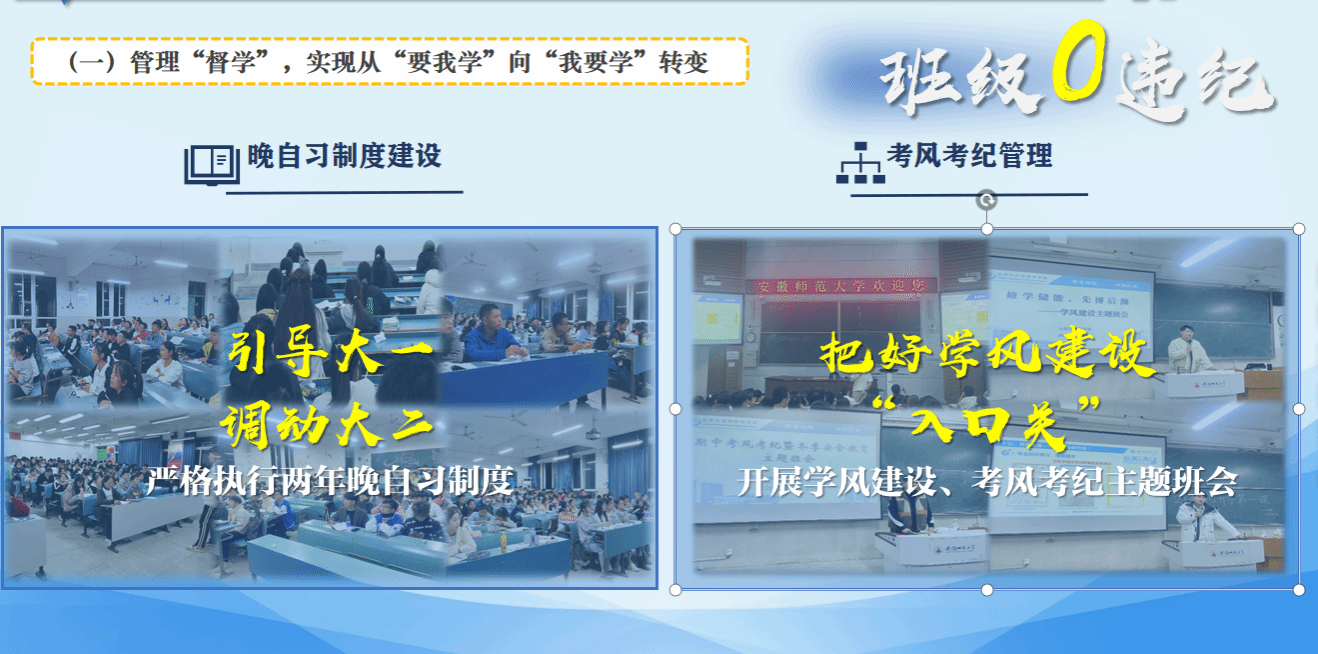 学风建设工作方案》,严格执行手机入袋、考勤制度;辅导员定期听课,通过学风建设、考风考纪主题班会,把好学风建设的“入口关”,班级“督学”效果显著。
