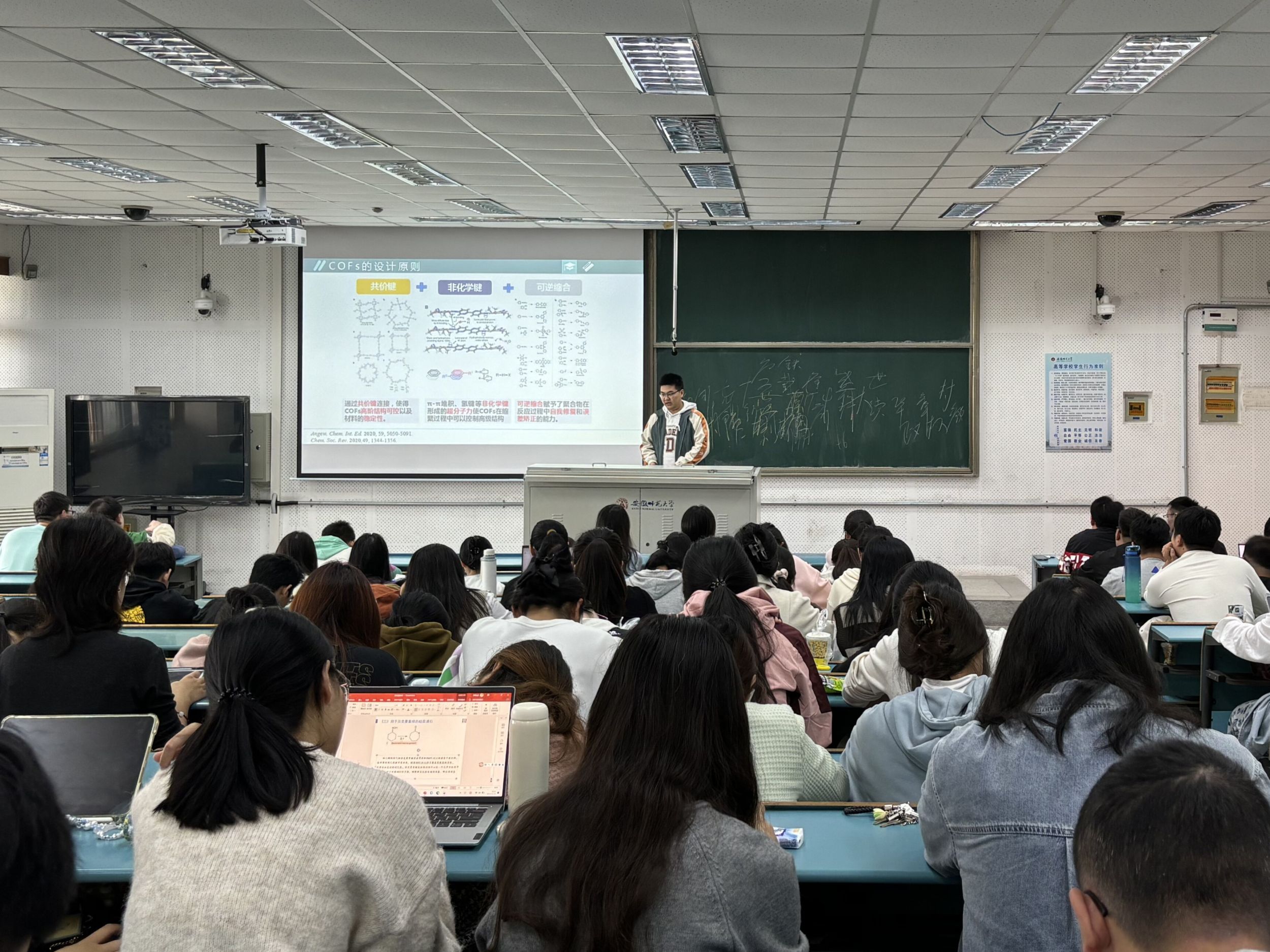 随后,2022级博士研究生曹汐以《电催化二氧化碳还原的研究》为题,详细解释了纳米颗粒的引入对二氧化碳还原过程的影响。2022级材料科学与工程专业硕士研究生杨懿栋向与会同学介绍了个人研究成果:在H形池中,Cu的加入对MnO2的的Urea的合成性能和稳定性的影响。2022级化学专业硕士研究生谢涛从选题背景、设计思路、设计原则、合成方法和机理探究等角度讲解了个人学术成果。2022级博士研究生夏蒙蒙以《自催化反应调节纳米粒子组装用于肿瘤特异性成像和治疗》为题,认真讲解如何进行实验设计,讲解过程丝丝入扣。2022级博士研究生吴昊以《光催化非张力酮脱酰基构建C-X键的反应研究》为题,讲解文章的研究背景和研究内容。