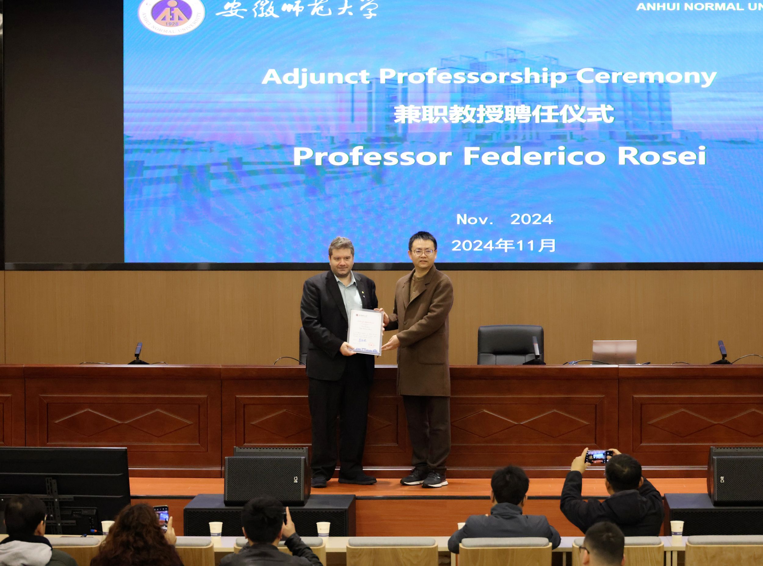 2024年11月20-22日,意大利的里雅斯特大学Federico Rosei院士访问我校,并举行系列学术活动。11月21日,Federico Rosei院士受聘我校兼职教授仪式暨学术报告会在文典楼西侧裙楼三楼视频会议室举行。校党委副书记、常务副校长熊宇杰教授主持学术报告会,并向Federico Rosei院士颁发兼职教授证书。校人事处、国际交流合作处、包子漫画