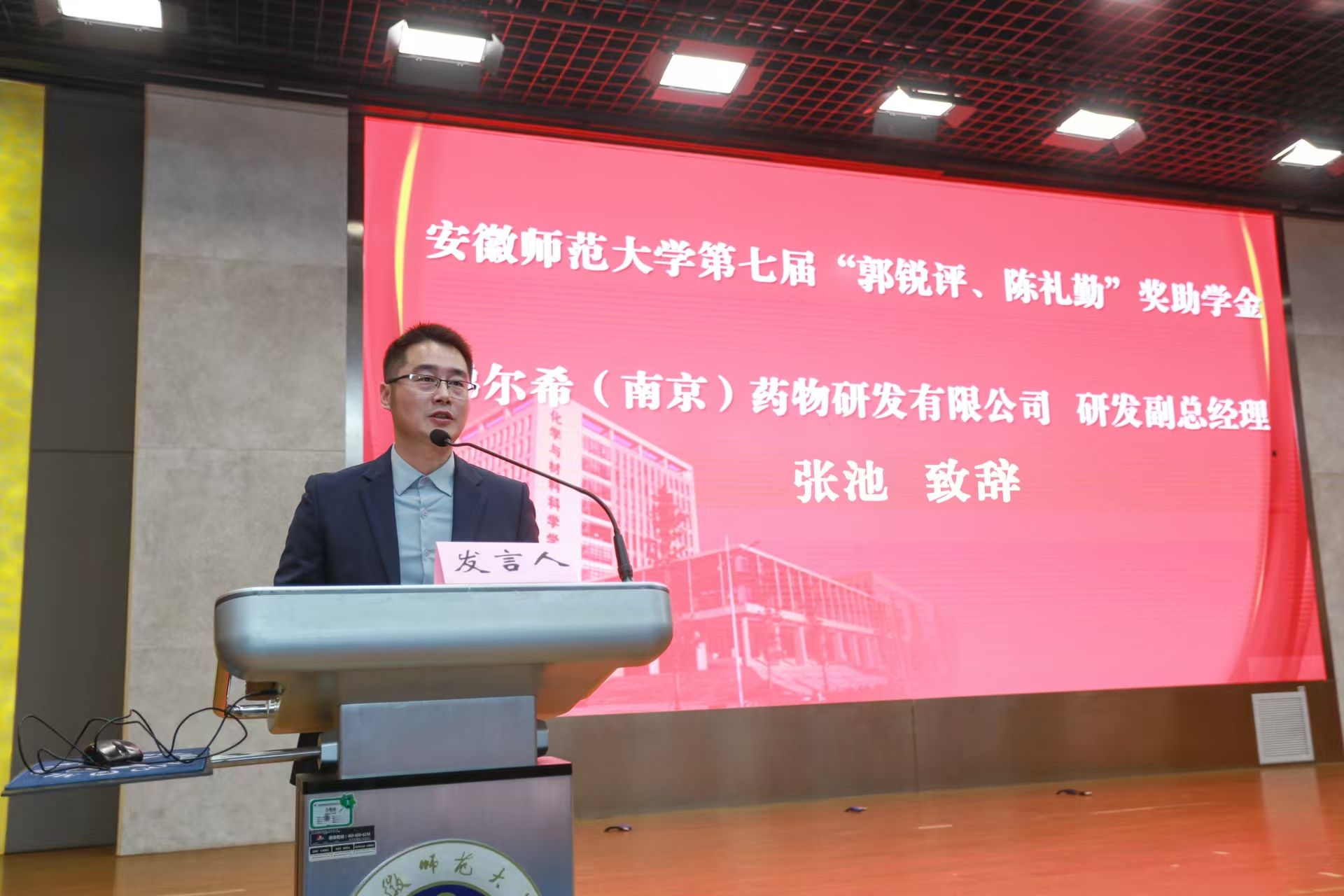 张池代表郭锐评女士、陈礼勤博士向获奖同学、受资助同学表示祝贺并表达了殷切的希望。他详细介绍了梯尔希(南京)药物研发有限公司基本情况和公司文化理念,讲解了公司化合物标准品的研发过程,希望各位同学能在学习发展过程中主动拓宽知识的宽度与深度,强化理论学习和实习实践的统一,做到教学相长。他希望广大同学能够不断培养自身责任感,树立终身学习的态度,不断提升自身能力,也希望广大同学毕业后能加盟梯尔希(南京)药物研发有限公司。