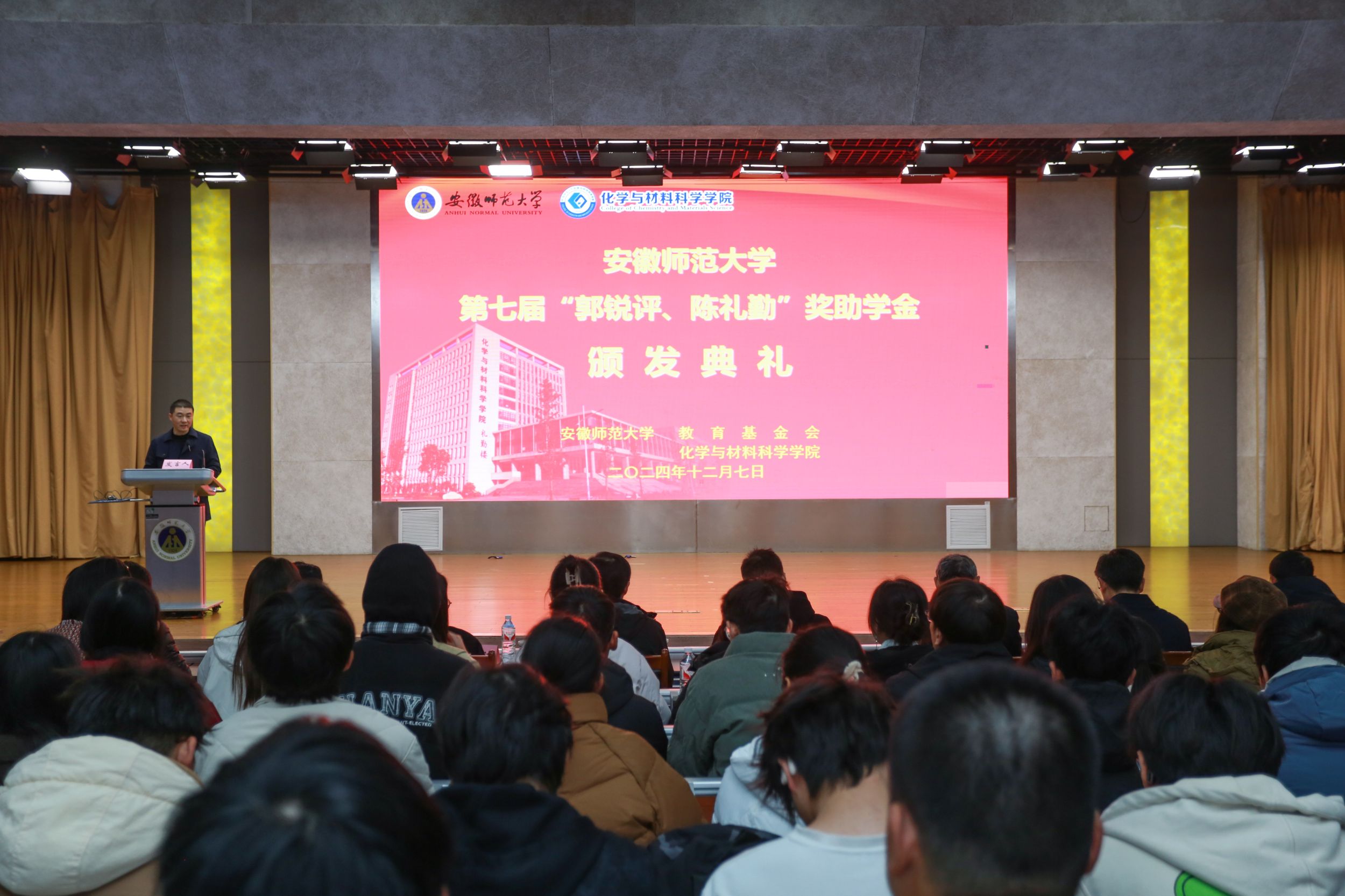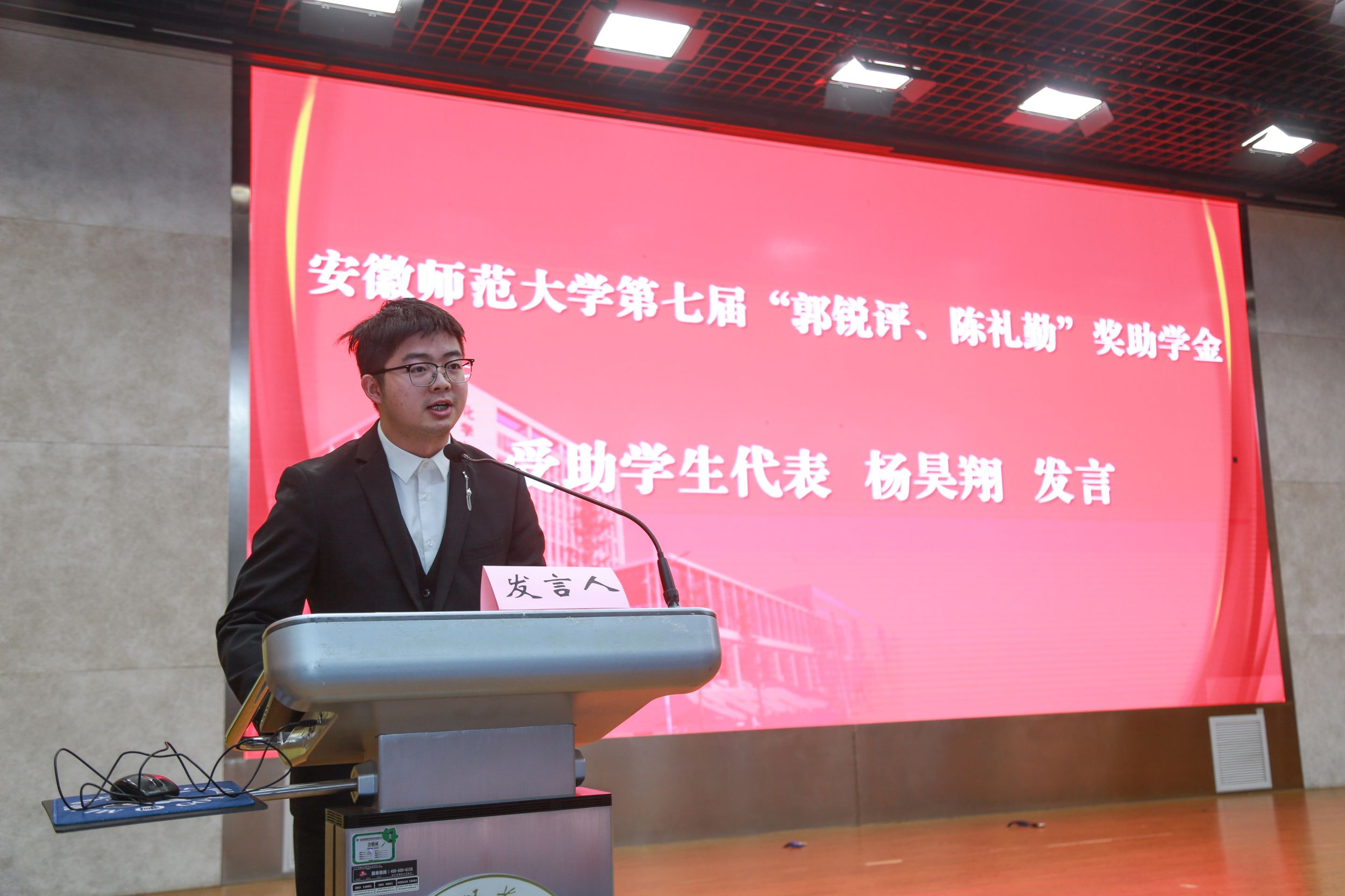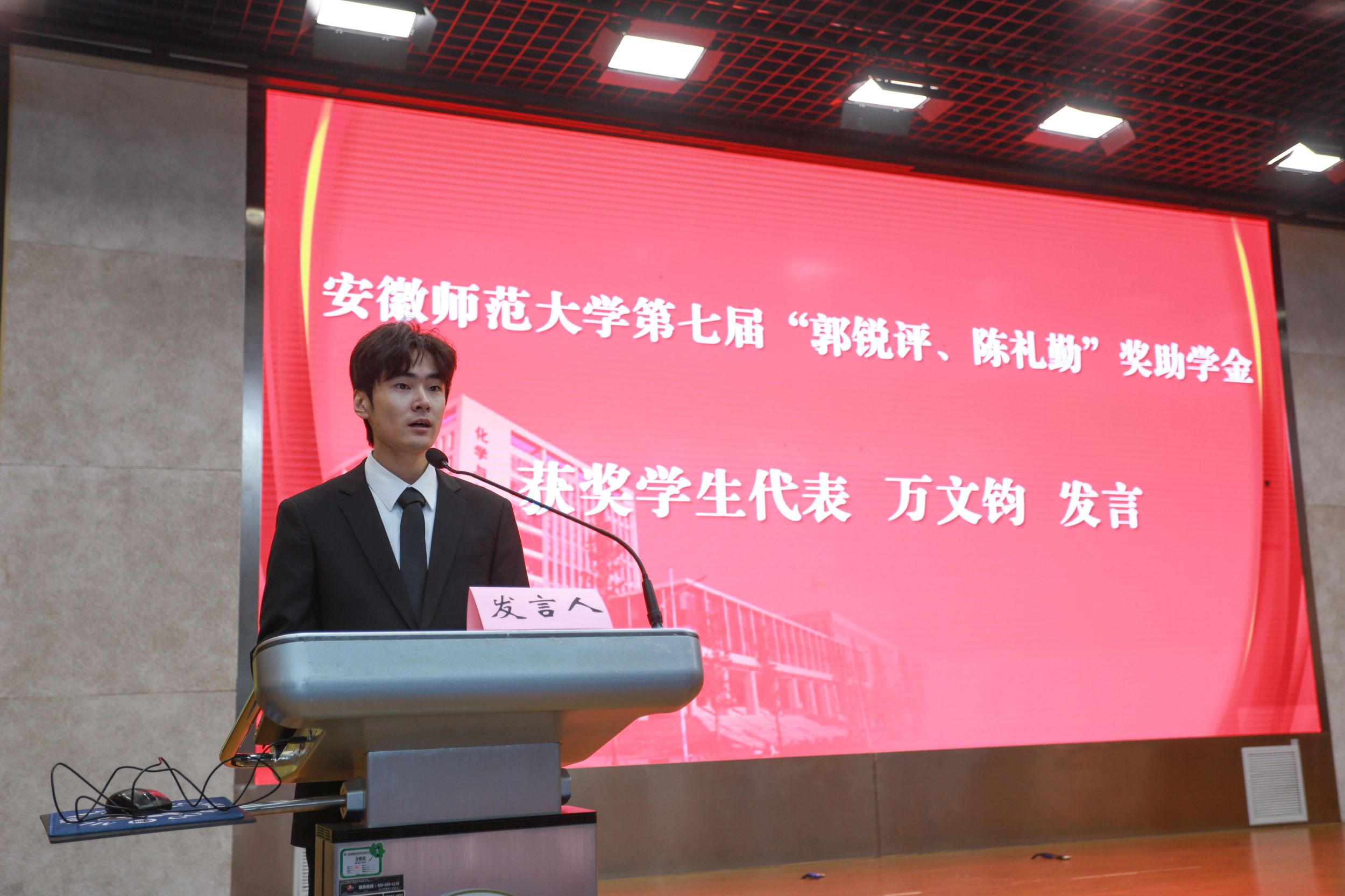 奖学金获奖代表2021级化学(师范)专业万文钧和助学金受助代表2022级化学工艺与工程专业杨昊翔先后发言,两位同学对郭锐评女士、陈礼勤博士的无私资助表达了诚挚的敬意,并向学校、学院老师和同学们的关心表达了感谢。两位同学表示将以更加优异的成绩来回报郭锐评女士、陈礼勤博士及学校学院给予的关心和帮助,带着这份荣誉与责任勇往直前。