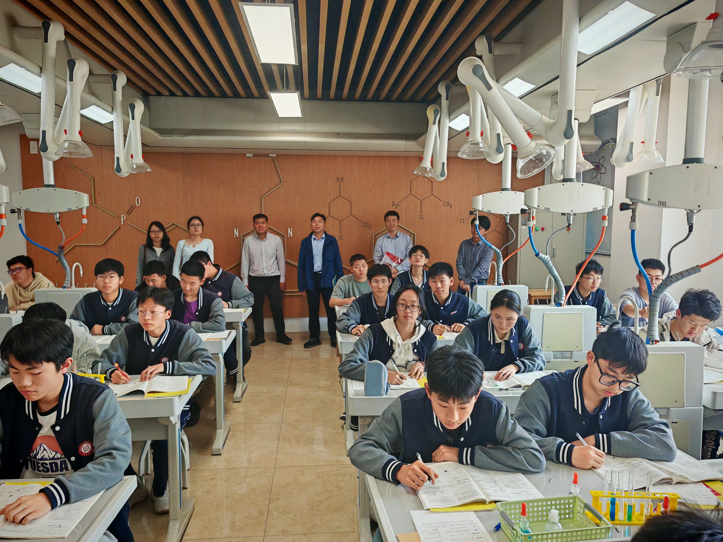 在常州市正行中学,学院调研组首先与正行中学校长高东梅、副校长蒋建兵、胡爱彬、党政办公室副主任黄刚及全体实习生展开座谈。实习生分别汇报了个人教学实践、班级管理、教研活动的收获,坦言“从学生到教师的角色转换充满挑战,但导师的悉心指导让自己快速成长”。崔鹏副院长勉励实习生:要珍惜一线教学机会,主动参与集体备课、教学研讨,在反思中提升课堂驾驭能力。随后,走进实习生课堂,观摩了2022级化学(师范)专业本科生张朕翔的公开课。张朕翔通过生活实例导入课程,借助多媒体动画演示反应机理,引导学生分组实验探究影响因素,课堂设计逻辑清晰、互动活跃。