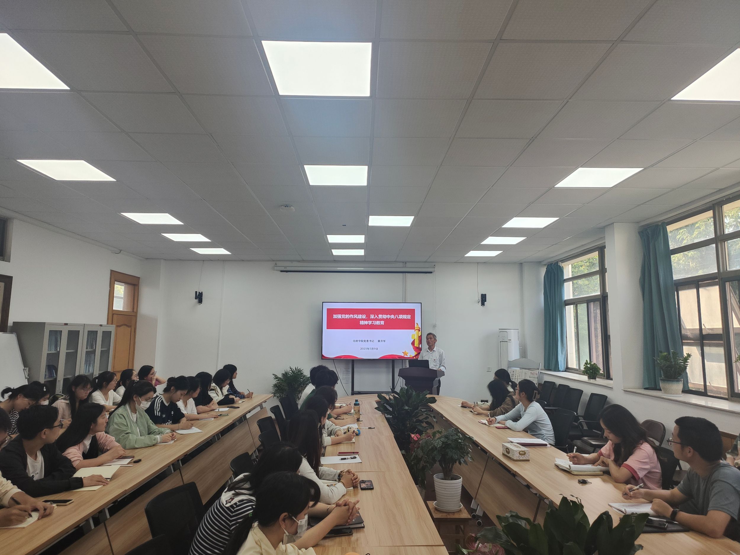 学院党委书记梁齐军为全体党员讲授《加强党的作风建设,深入贯彻中央八项规定精神学习教育》专题党课,他从中央八项规定精神的背景和意义、中央八项规定精神内容与实效、党的十八大以来党的作风建设的宝贵经验、当前党的作风建设面临的挑战、严守规矩推进作风建设常态化长效化五个部分讲授党课。他用深入浅出的语言,结合实际工作讲解违反中央八项规定精神具体表现,强调作风建设是党的本质属性和根本宗旨的内在要求,提醒全体党员,要严格要求自己,从现在做起,从我做起,强化理论学习,做到学纪、知纪、明纪、守纪,搞清楚党的纪律规矩是什么,弄明白能干什么、不能干什么,把遵规守纪、严守“八项规定”刻印在心,内化为言行准则。