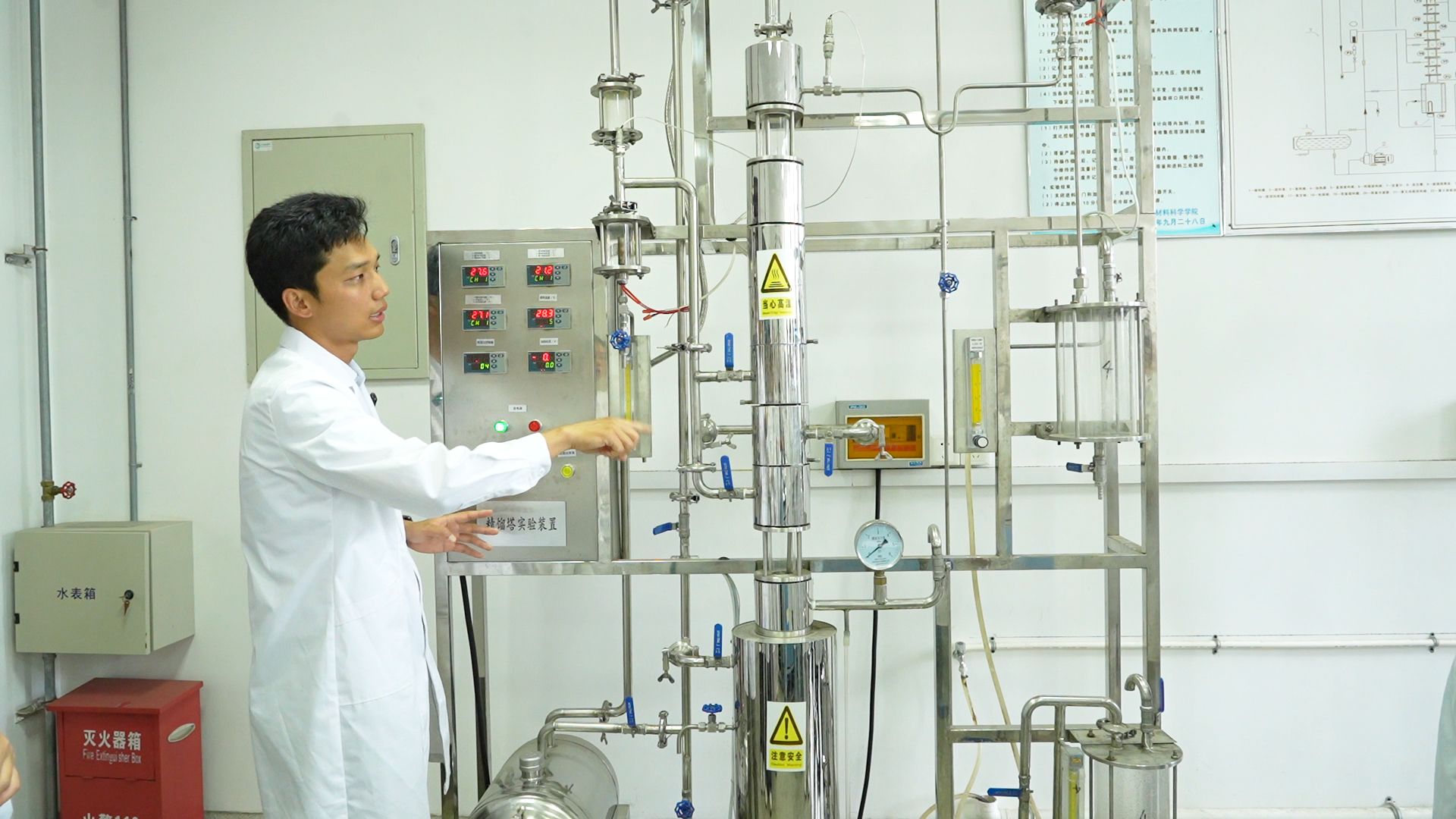 实验开始前,司家奇老师首先进行了细致的理论讲解。他从筛板精馏塔的基本构造和工作原理入手,通过展示工业级精馏塔运行数据与实验室装置参数的对比分析图,结合化工分离过程的核心理论,详细阐述了精馏操作的关键要点和塔效率测定的意义,并在黑板上画出精馏塔的结构示意图,深入浅出地讲解着每一个部件的作用,让学生们对实验的目的和背景有了清晰的认识。