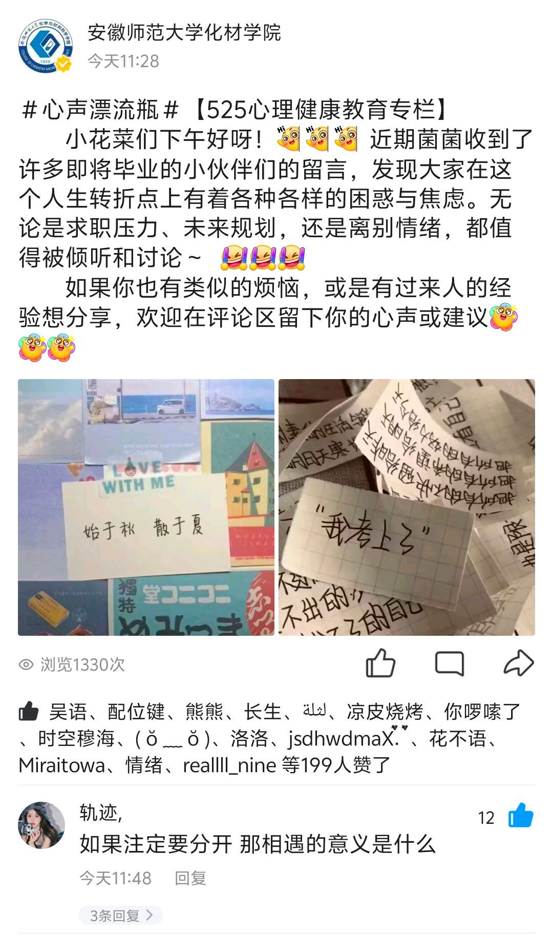 “心声漂流瓶”活动在校园里架起了一座心灵沟通的桥梁。同学们用精致的漂流瓶,将内心的烦恼、困惑、愿望或是鼓励的话语认真书写下来,放入瓶中。随后,大家随机抽取他人的漂流瓶,阅读并留下暖心的回复。小小的漂流瓶,承载着同学们最真实的心声,也传递着陌生人之间的善意与温暖。不少同学表示,通过这种匿名交流的方式,自己倾诉了烦恼,也收获了意想不到的安慰与建议,感受到了校园里满满的人情味。