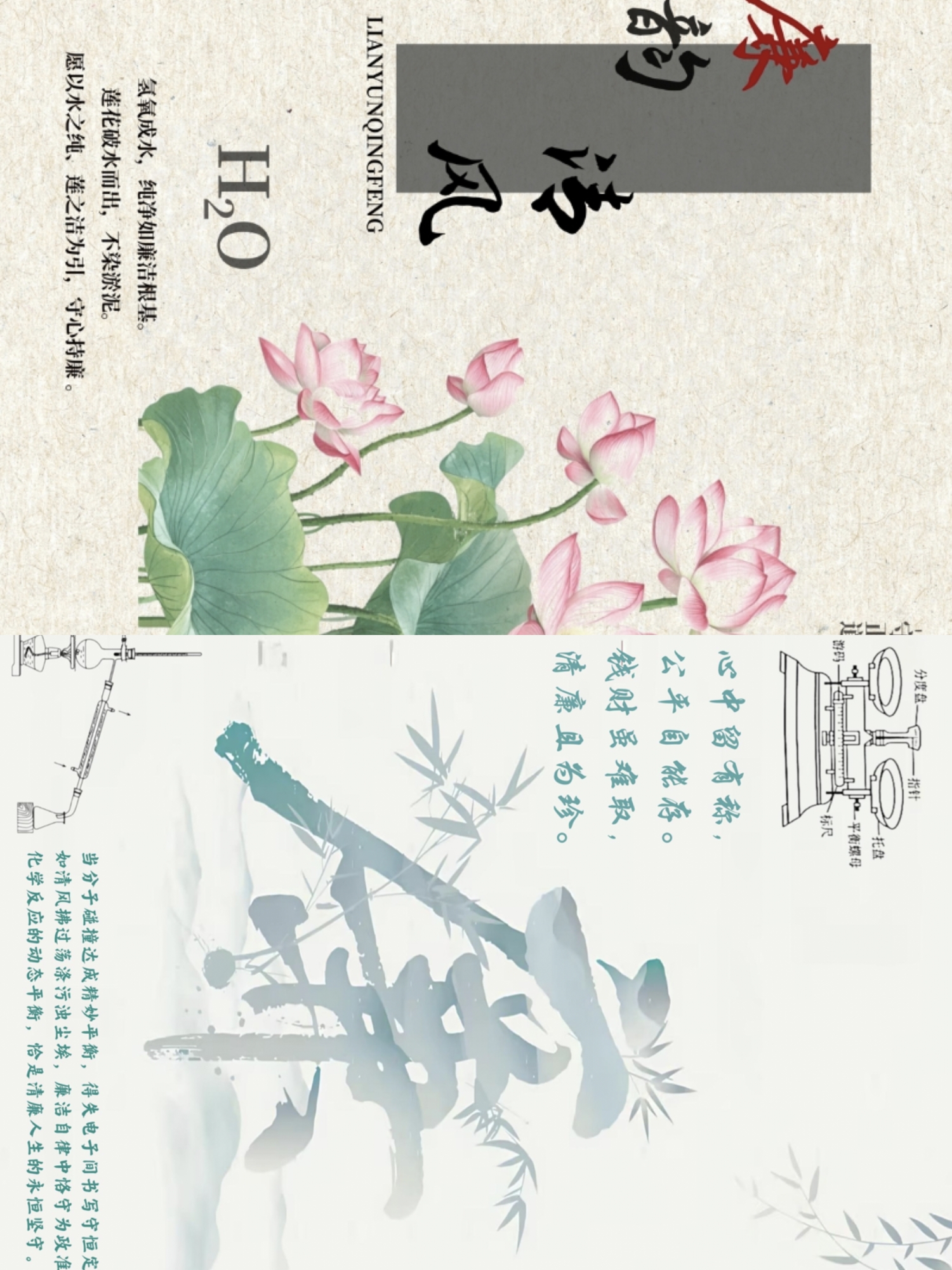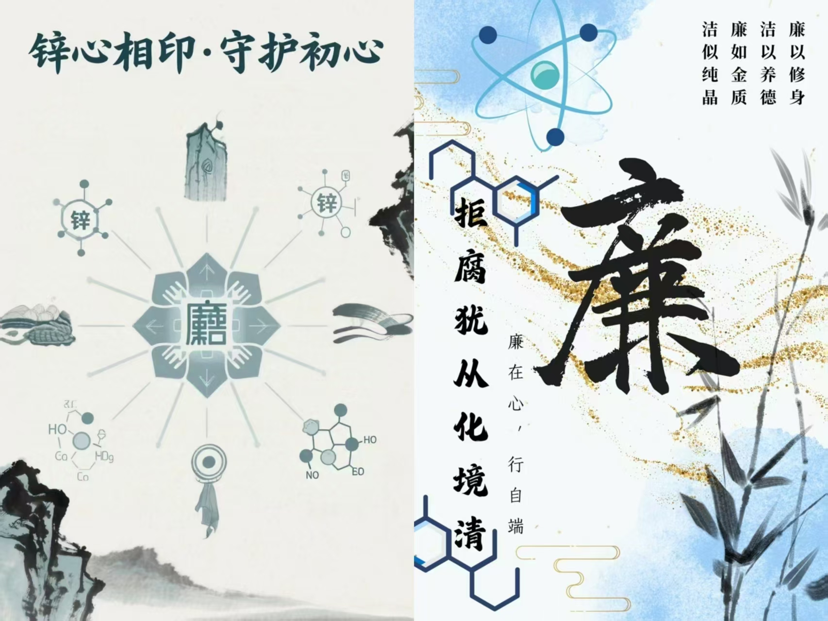 本次比赛以“廉韵润心田,清风促发展”为主题,鼓励以党支部、教研室、团支部、团小组等为单位参赛,主要征集廉洁文化题材的艺术作品。各党支部、班级团支部充分发挥专业优势,深度挖掘化学学科中的廉洁教育元素。有的借化学元素的稳定特质,阐释廉洁坚守的永恒定力;有的以纯净物质的色泽形态,映照清正廉洁的纯粹本色;有的从过滤、蒸馏等分离操作联想,寓意党员要像滤纸筛除杂质般,剔除贪腐念想、守好初心;有的用氧化还原等电化学原理,展现拒腐与守廉的辩证统一,将专业知识化作传播廉洁理念的桥梁,以廉韵润心田,以清风促发展。