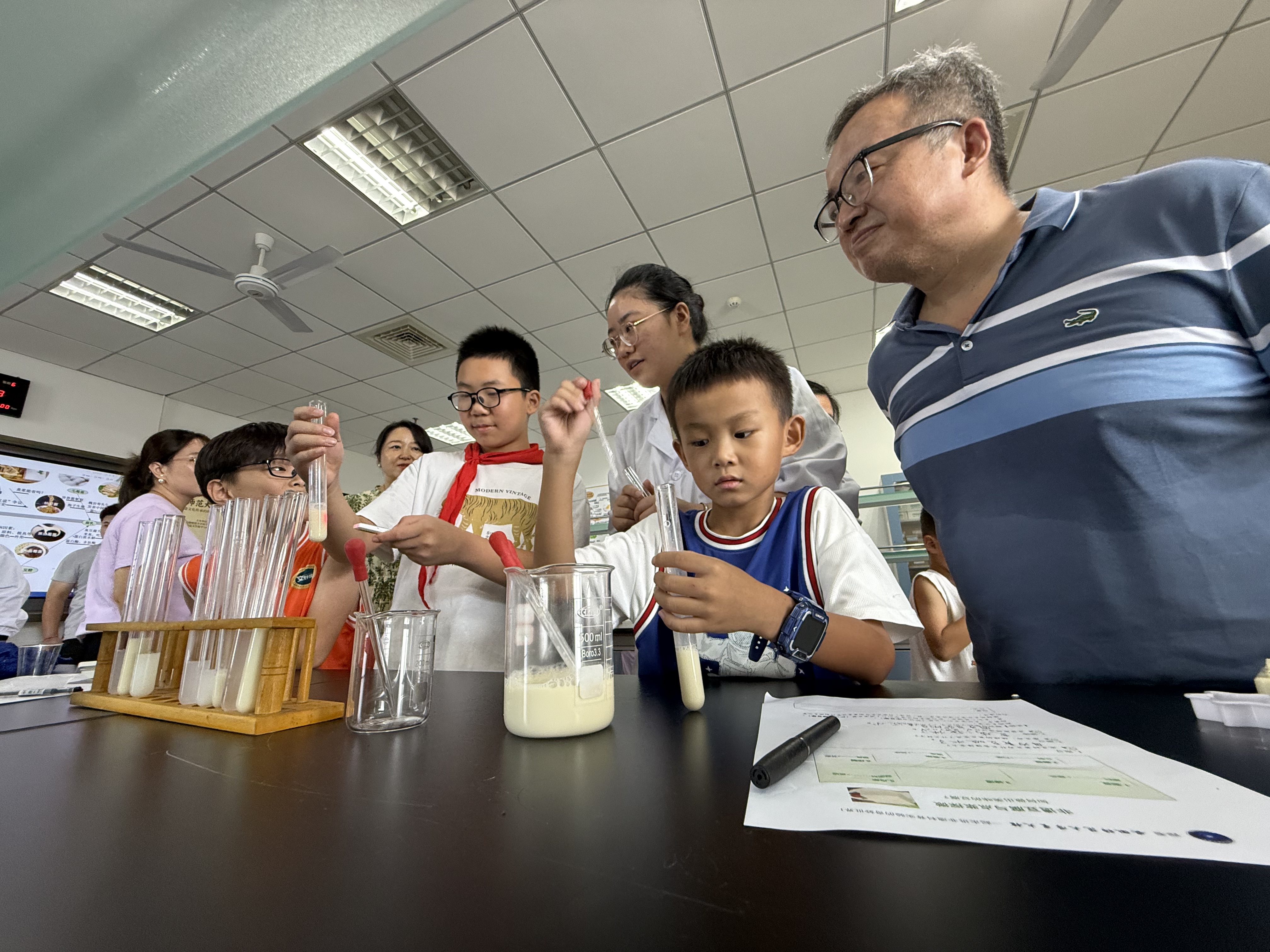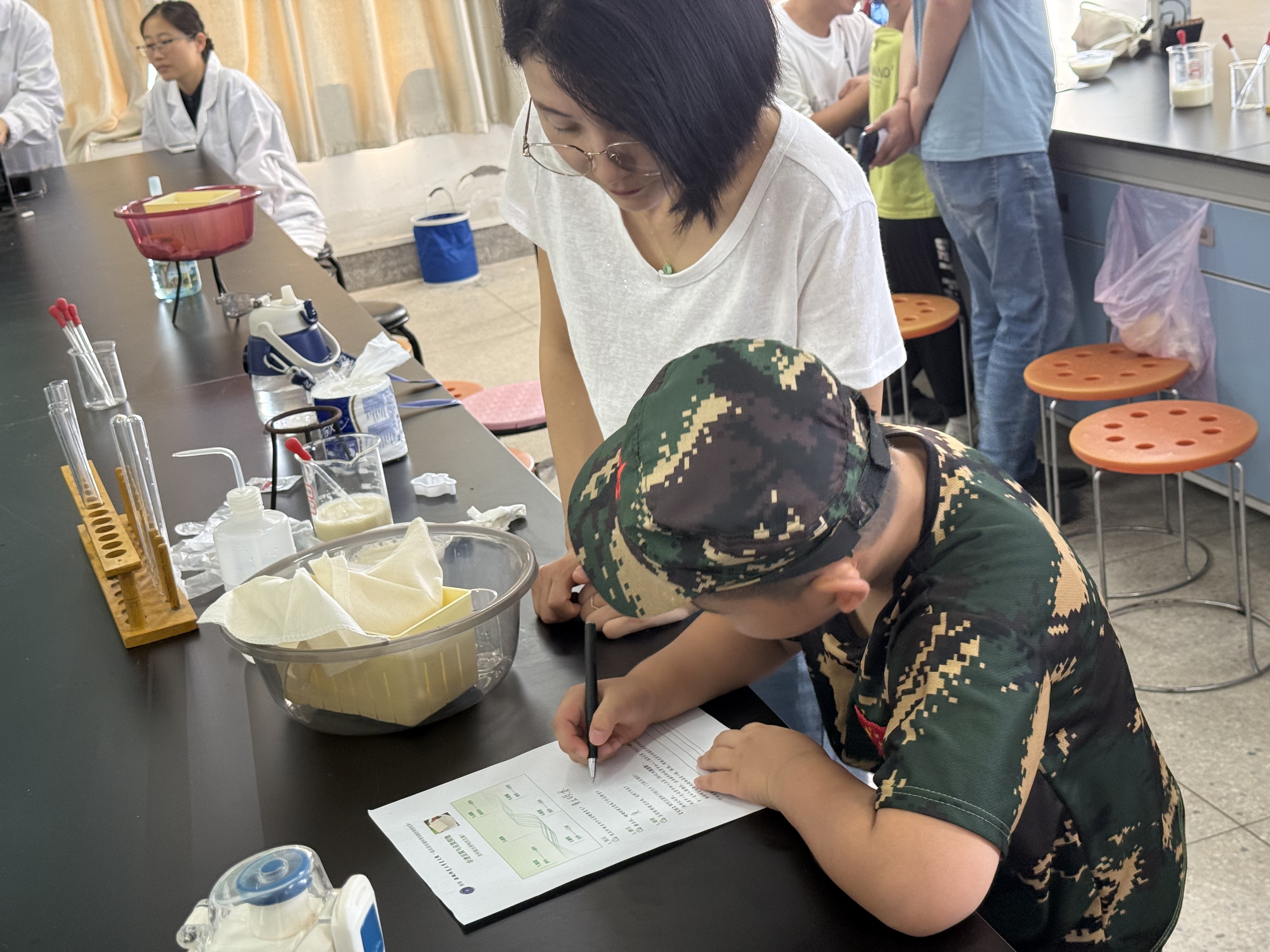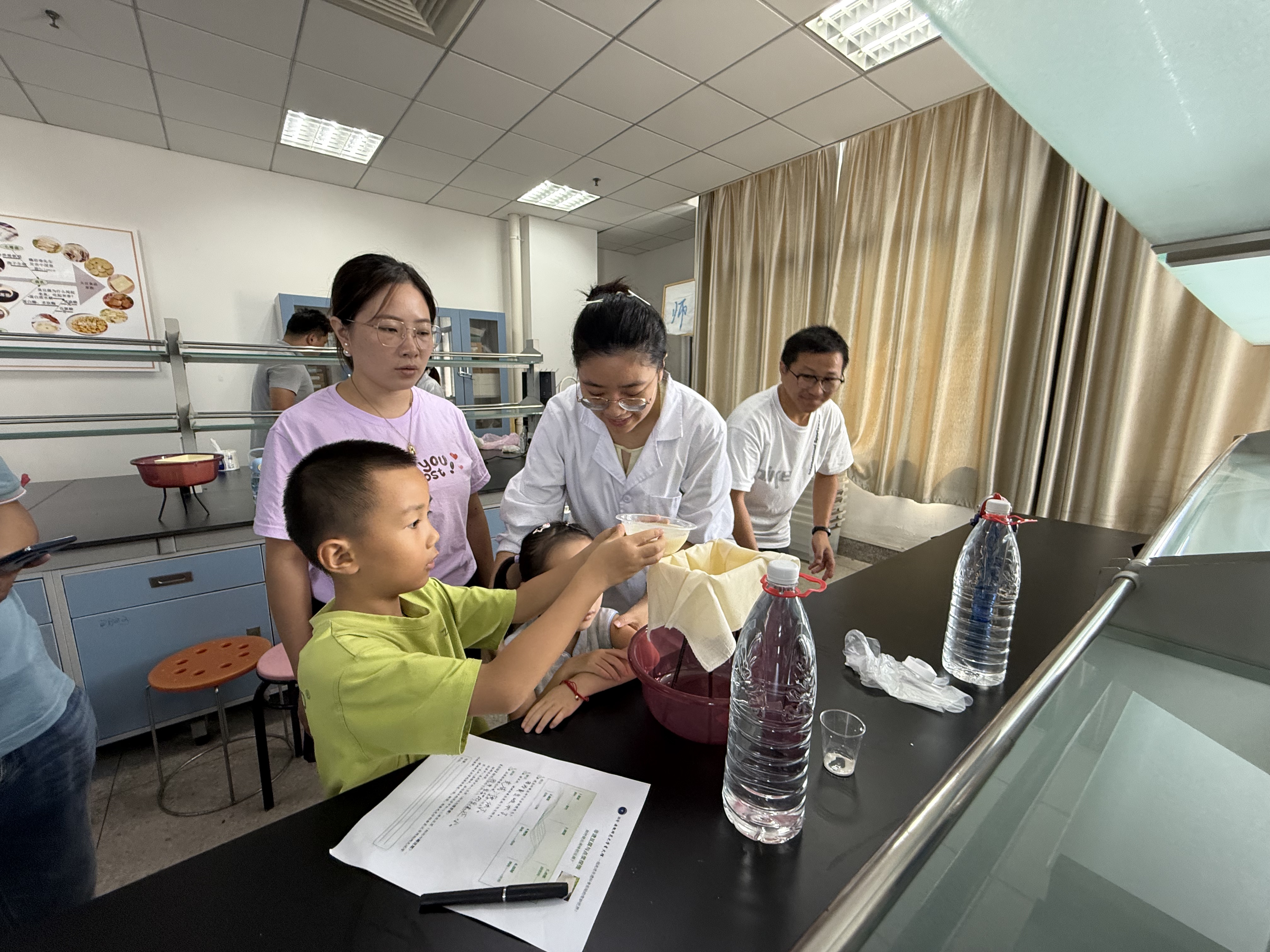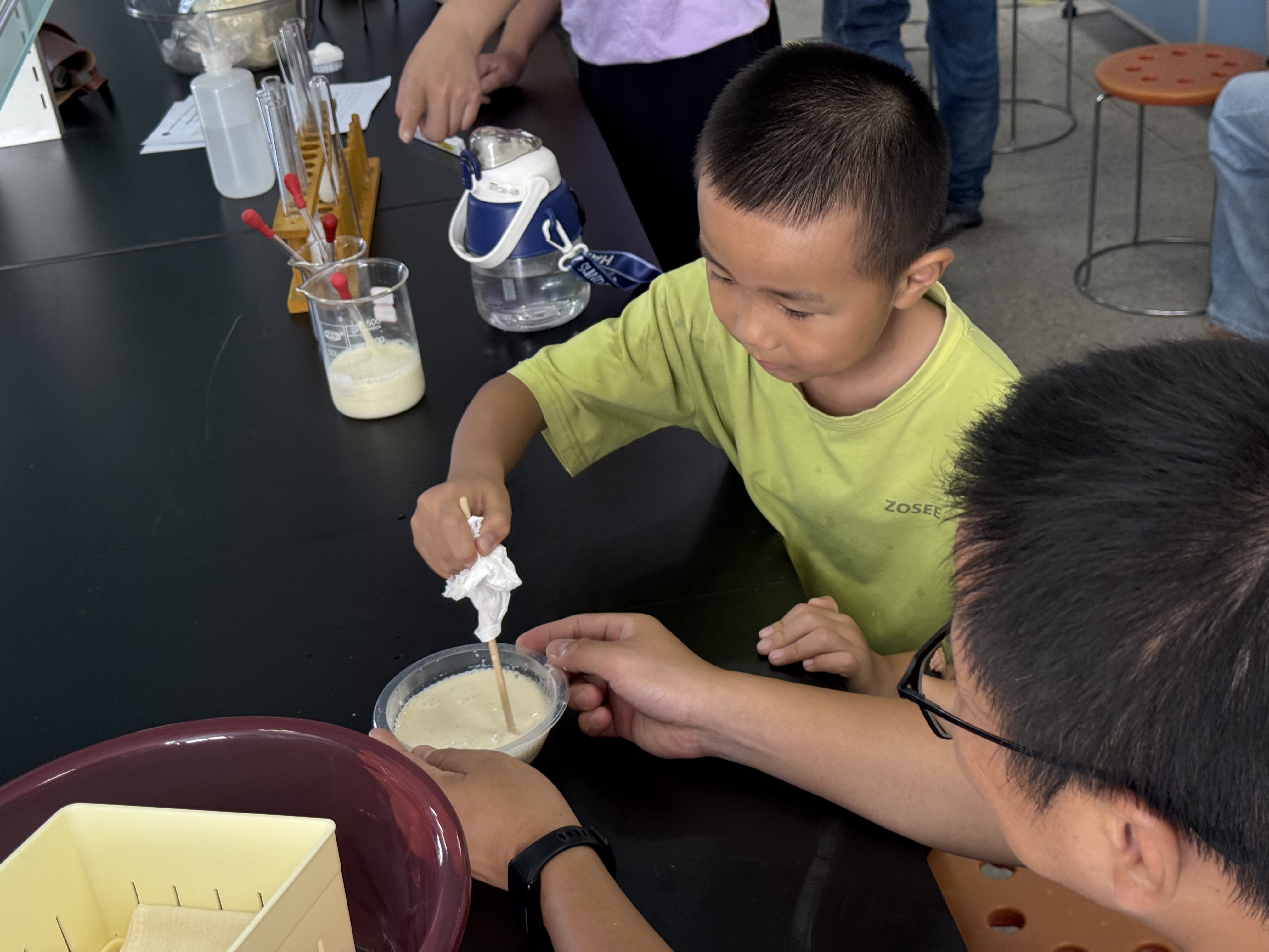 活动尾声的 “成果验收” 充满惊喜:一组学生用石膏或内酯成功制出豆腐,而另一组则因首次操作时豆浆温度不足而未能凝固,这场小插曲让孩子们笑着领悟 “做豆腐也需讲科学” 的道理。最后,孩子们填写学案,记录实践中的感悟,让科普认知更扎实。