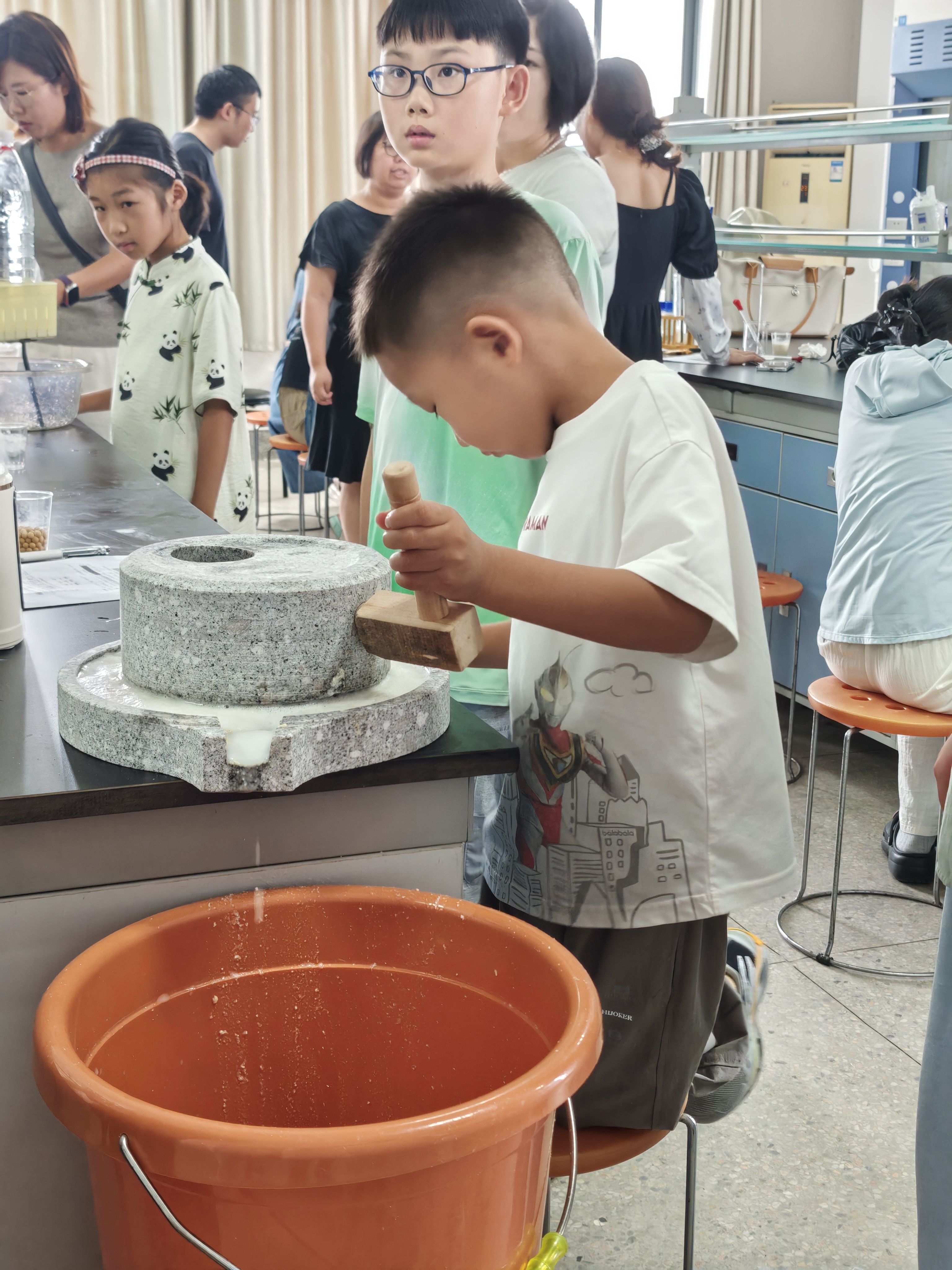 实践环节里,孩子们化身 “非遗小匠人”,完整体验黄豆 “变身” 豆腐的全流程:泡豆时观察黄豆吸水膨胀的变化,磨豆时感受颗粒到细腻的蜕变,滤渣时分离豆浆与豆渣,煮浆时紧盯翻滚的泡沫,点浆时屏息等待凝固,压制时小心塑造豆腐形态。当手电筒光束穿透豆浆形成清晰光路,孩子们惊呼 “像魔法”—— 丁达尔效应的直观呈现,让抽象的科学概念变得可感可知。
