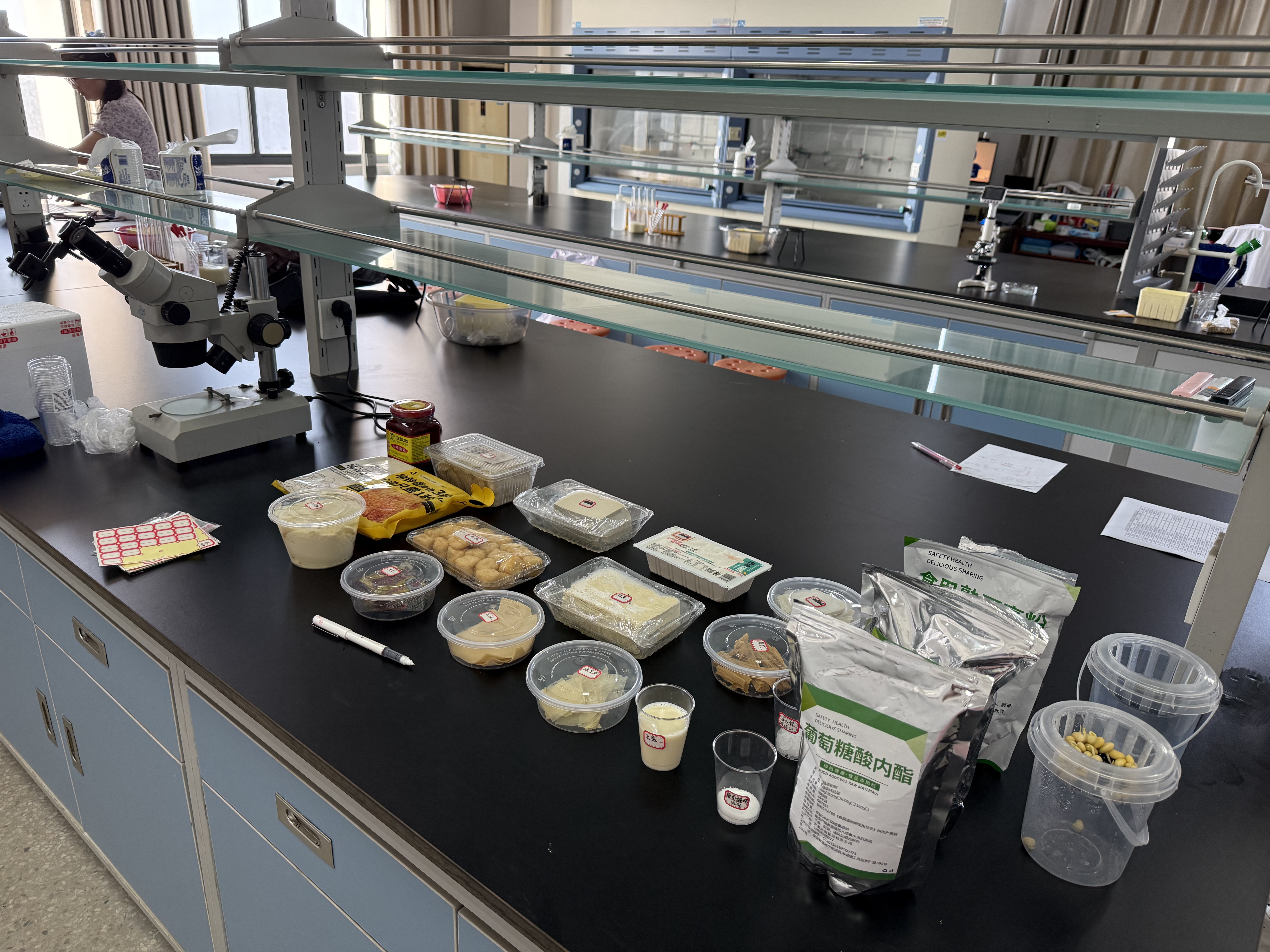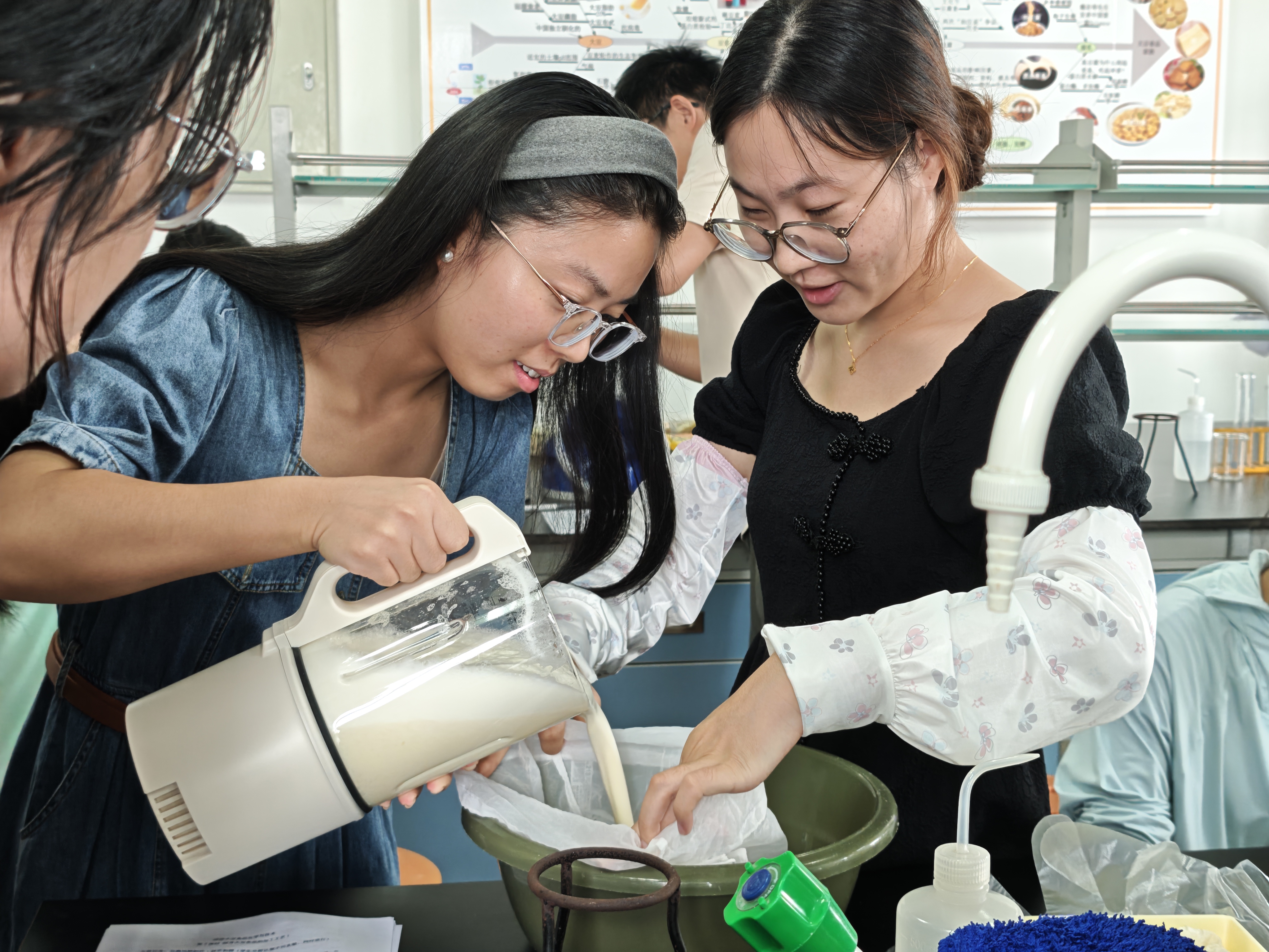 9 月 7 日上午则聚焦 “豆腐里的化学密码”,将探索推向深入。志愿者铺垫完豆腐的历史文化背景后,抛出 “豆浆都是胶体吗?”“蛋白质变性如何影响口感?”“凝固剂作用原理是什么?” 等问题,引导大学生开启 “科研式体验”。学生们分组设计对照实验,有的探究石膏、内酯、卤水三种凝固剂对豆腐质地的影响,有的分析煮浆温度与时间对成品口感的作用,还有的调整豆水比例以观察其与豆腐硬度的关联。