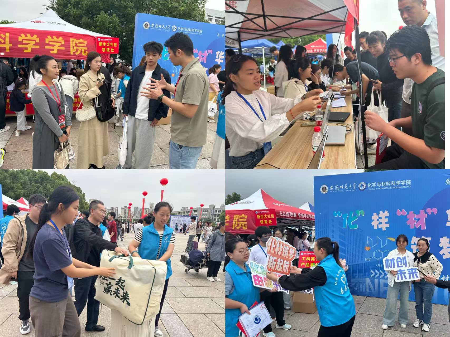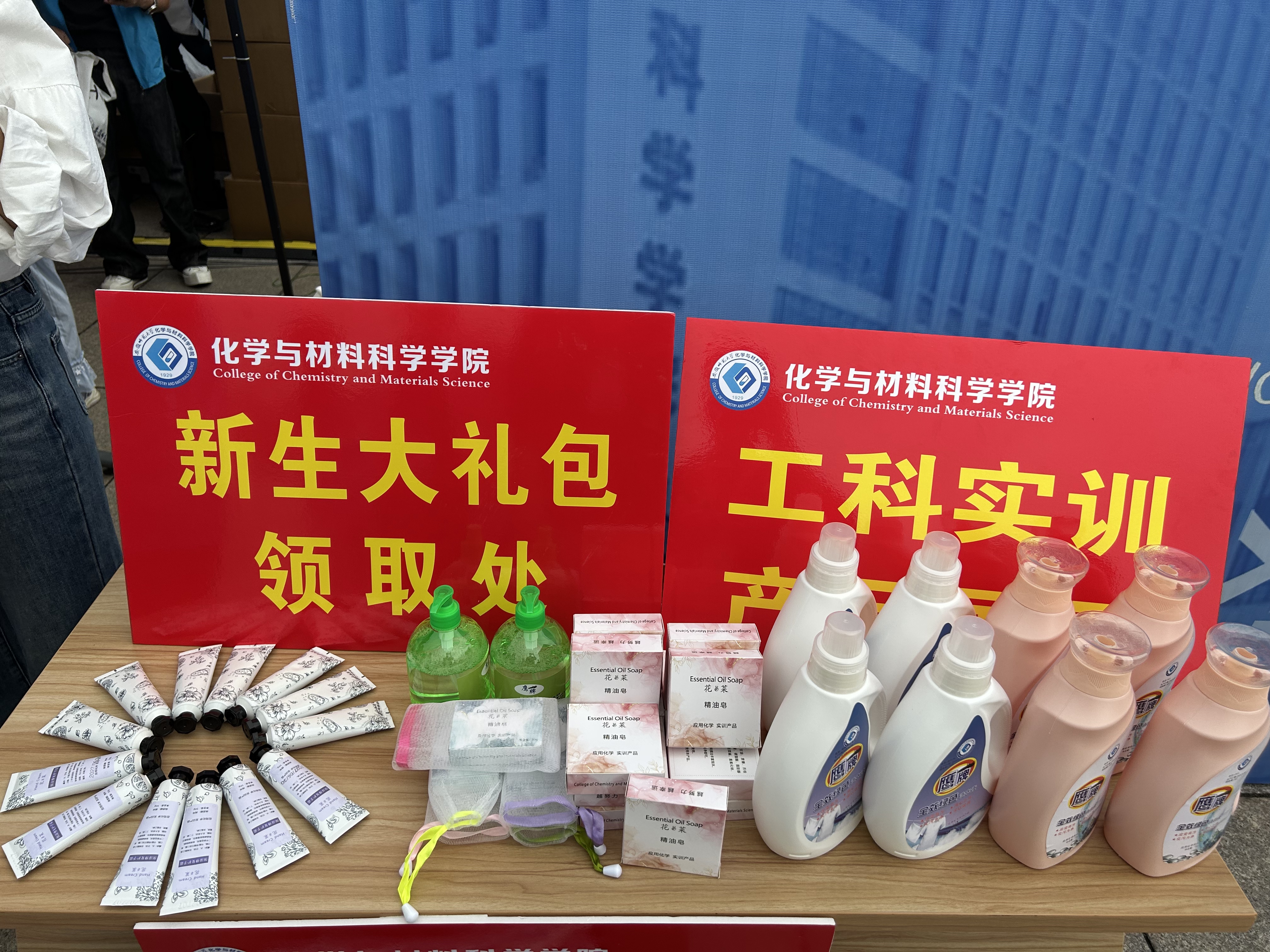 logo的帆布袋内,不仅装着由高年级学生参与实习实训制作的洗手液、洗衣液、护手霜等实用物资,还贴心配备了彩色卡套、实验服等学习生活必备品,让新生在感受学院专业特色的同时,也体会到“化材大家庭”的温暖。