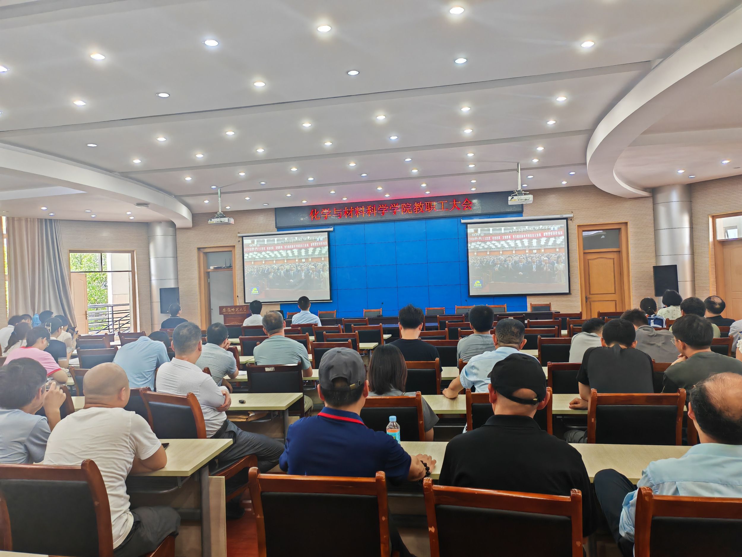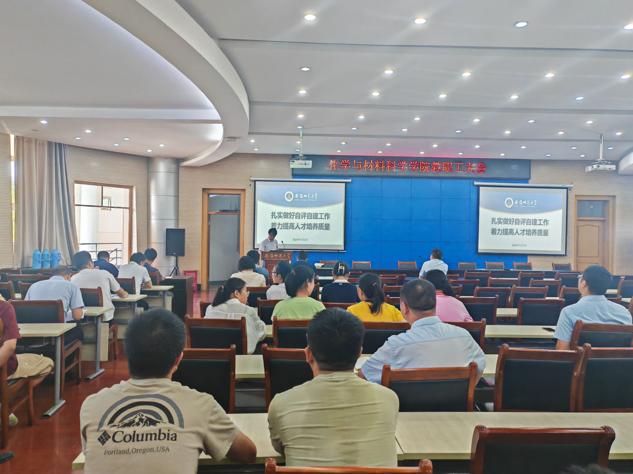 在会议中心第三报告厅召开教职工大会开展本科教育教学审核评估工作专题报告,师德师风专题警示教育,布置暑期重点工作,全体教职工参加会议。会议由学院党委书记汪俊武主持。